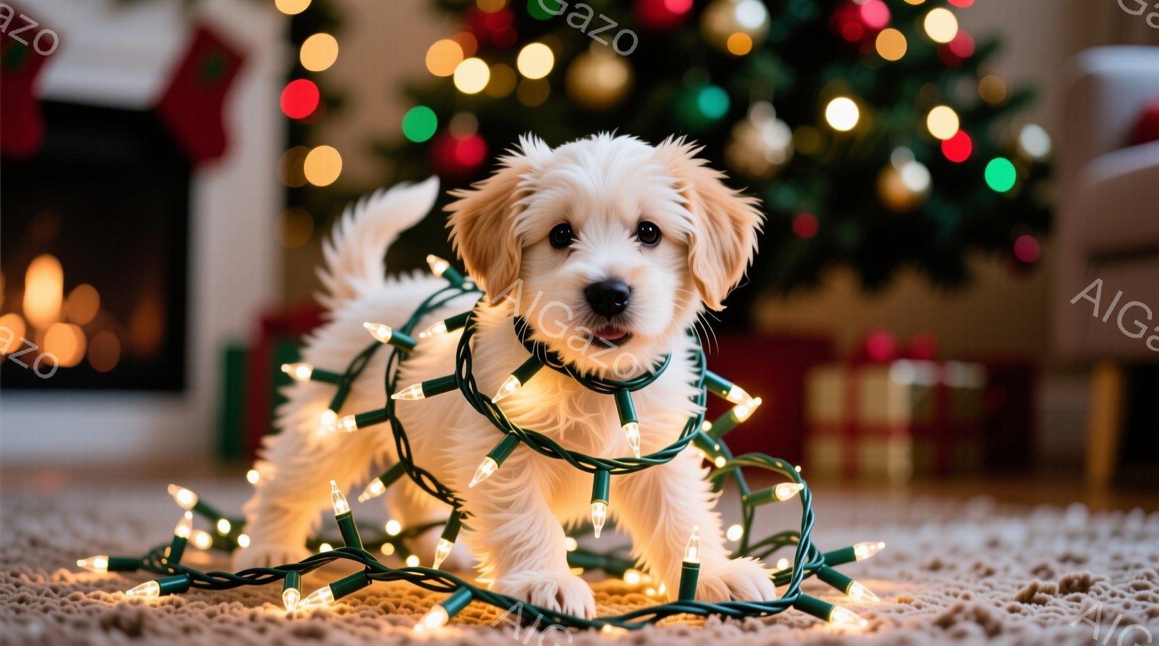 ふわふわの白い毛並みの犬が、クリスマスツリーのイルミネーションライトにからまりながら床に横たわっています。犬は口を開けて微笑んでおり、リラックスした様子が伺えます。背景にはぼやけたクリスマスツリーと暖炉があり、温かく居心地の良い雰囲気です。