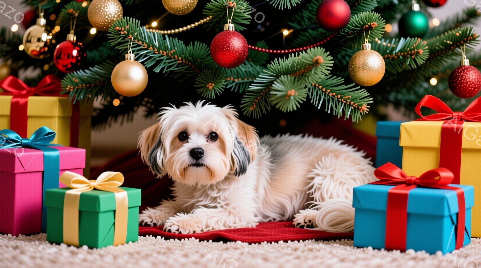 白いふわふわの犬が、クリスマスツリーの下の赤い敷物の上に横たわっています。犬はリボンで飾られた様々な色のギフトボックスに囲まれ、リラックスした表情をしています。背景には緑のクリスマスツリーが飾られ、キラキラと輝く電飾が暖かく優しい雰囲気を醸し出しています。
