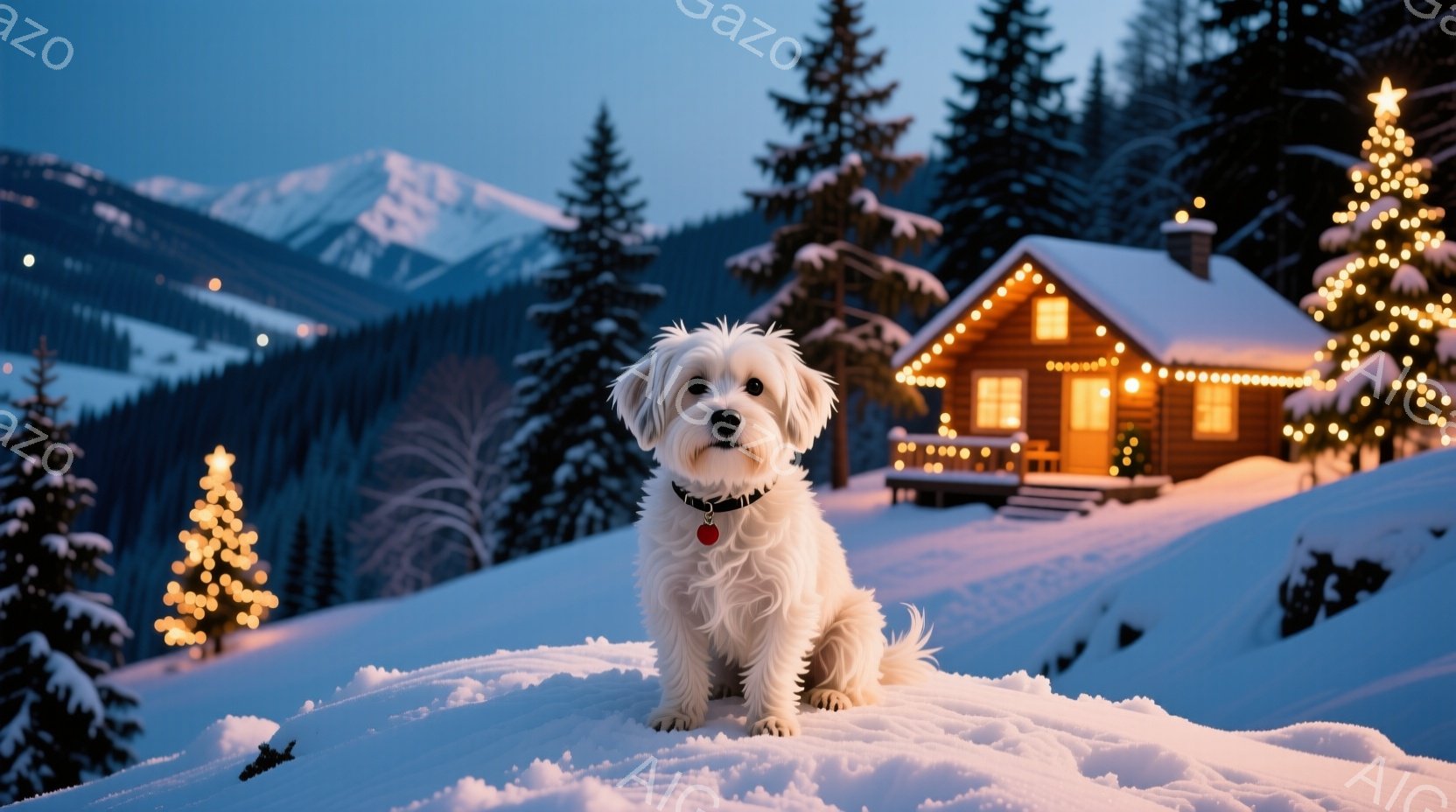 白い毛並みの小型犬が雪の上に座っており、赤い首輪をつけている。背景にはクリスマスツリーのように飾り付けられた木々と、温かい光が灯る可愛らしいキャビンが見える。雪景色とキャビンの明かりが、温かく幻想的な冬の雰囲気を醸し出している。