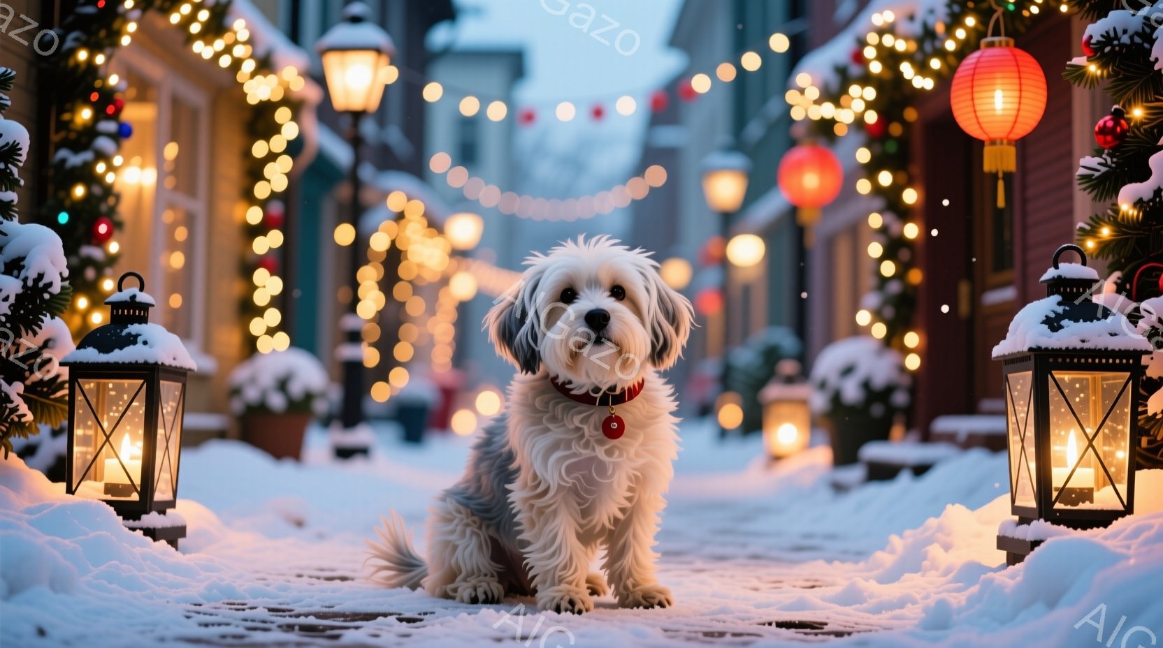 白いふわふわの犬が雪で覆われた石畳の道に座っています。赤い首輪をつけており、落ち着いた表情で正面を見ています。背景には、クリスマスのようなイルミネーションが飾られた建物が並び、雪が舞う冬の景色が広がっています。