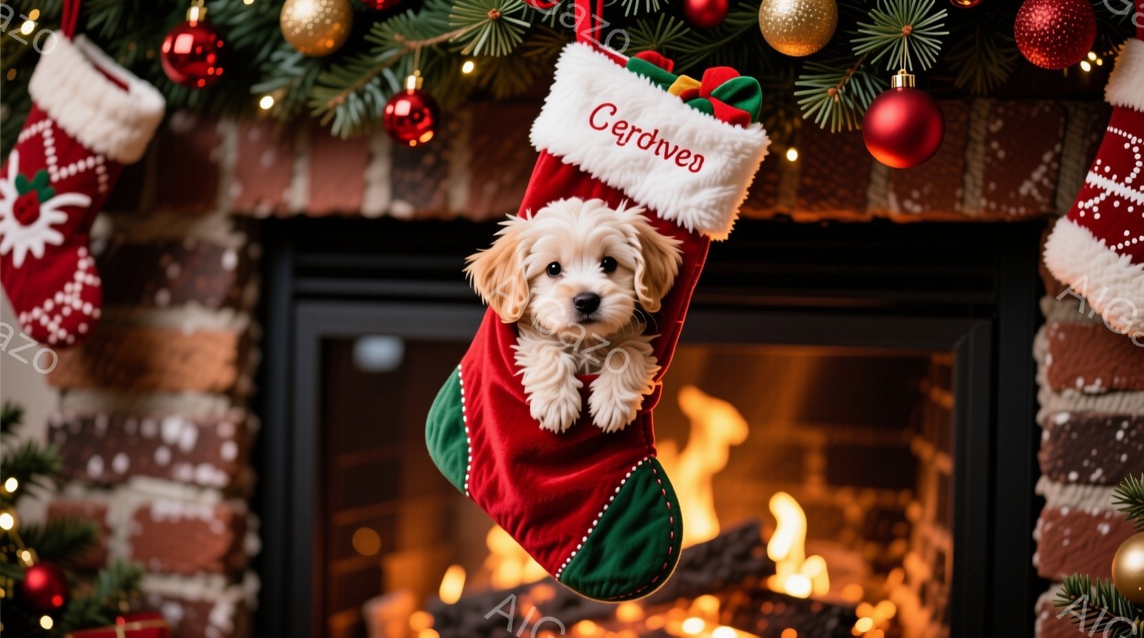 暖炉のそばに飾られたクリスマスストッキングの中に、ふわふわの金色の毛並みの子犬が顔を出しています。子犬は少し戸惑った表情で、好奇心いっぱいの目をこちらに向けています。背景にはクリスマスツリーの飾りや暖炉の炎が見え、温かく、幸せなクリスマスの雰囲気が漂っています。