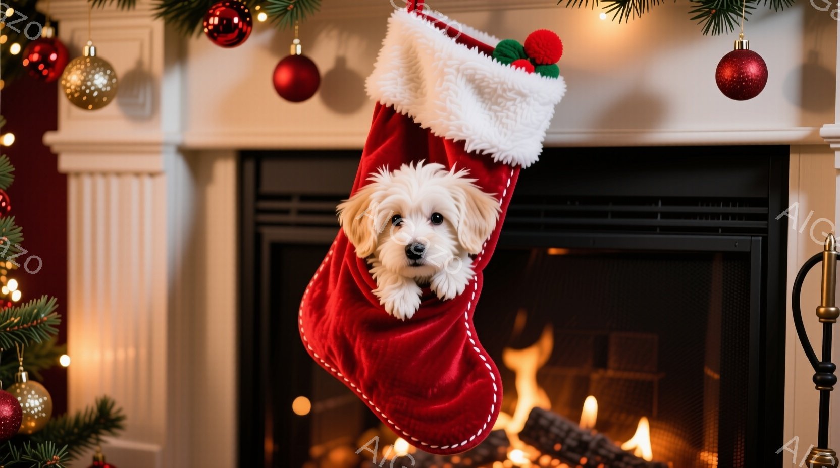 赤いクリスマスストッキングが暖炉の上に掛けられており、中にはふわふわの金色の毛並みを持つ子犬が可愛らしく顔を出しています。暖炉の中では炎が揺らめき、背景には装飾されたクリスマスツリーとプレゼントが見え、温かくお祝いムードに包まれています。この画像は、ホリデーシーズンの暖かさと可愛らしさを強調した、心温まる光景です。