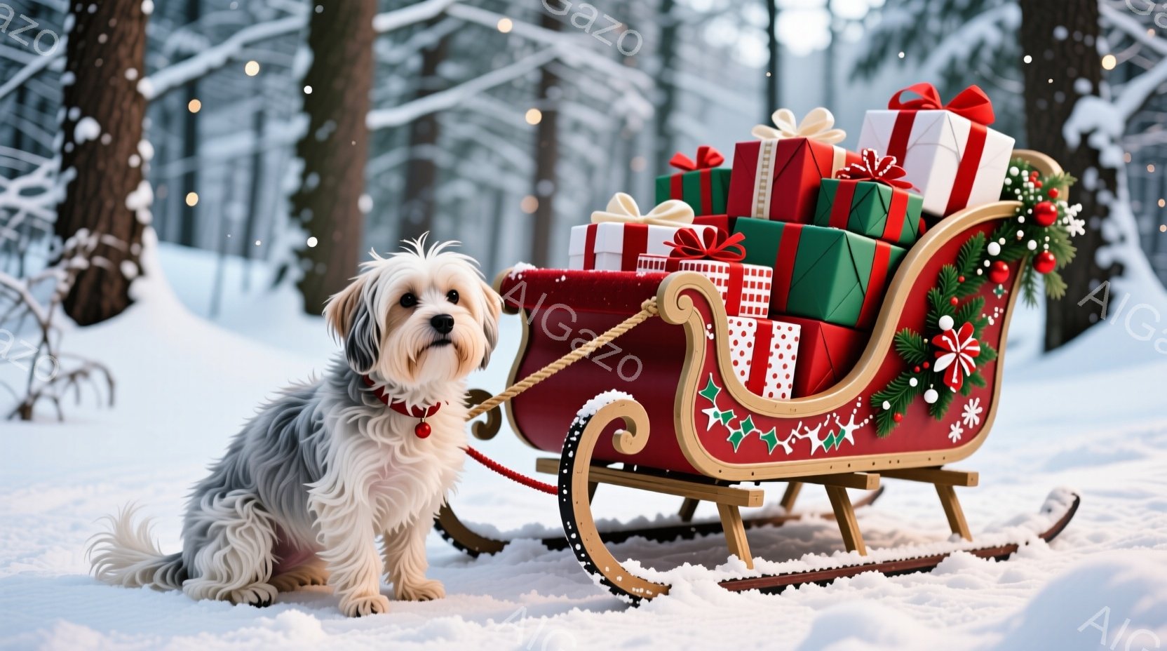 白とグレーの毛並みを持つ小さな犬が雪の上に座り、赤い装飾が施されたソリの前にいます。ソリには緑、赤、金色の包装紙で包まれた様々な大きさのプレゼントが山積みにされており、緑色の飾り付けが施されています。背景は雪に覆われた森で、冬の静かで幻想的な雰囲気を醸し出しています。