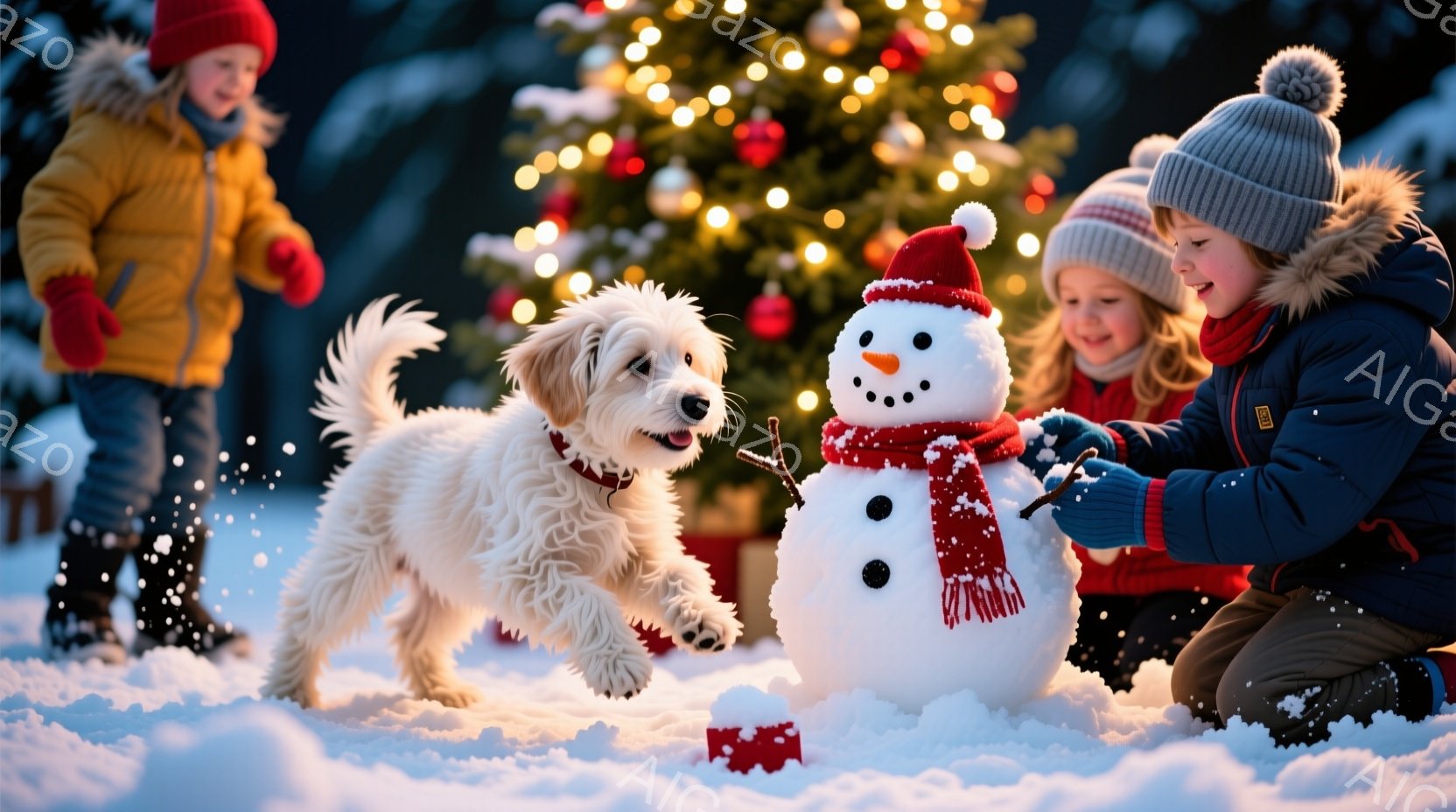 雪景色の中で、幼い少年と少女が雪だるまを作っています。少年は赤い帽子をかぶり緑色のジャケットを着て、雪だるまの腕を設置するのを手伝っています。少女は赤いジャケットと帽子をかぶり、雪だるまに炭で目と口を描いており、背景にはクリスマスツリーが輝き、暖かく幸せな雰囲気を醸し出しています。