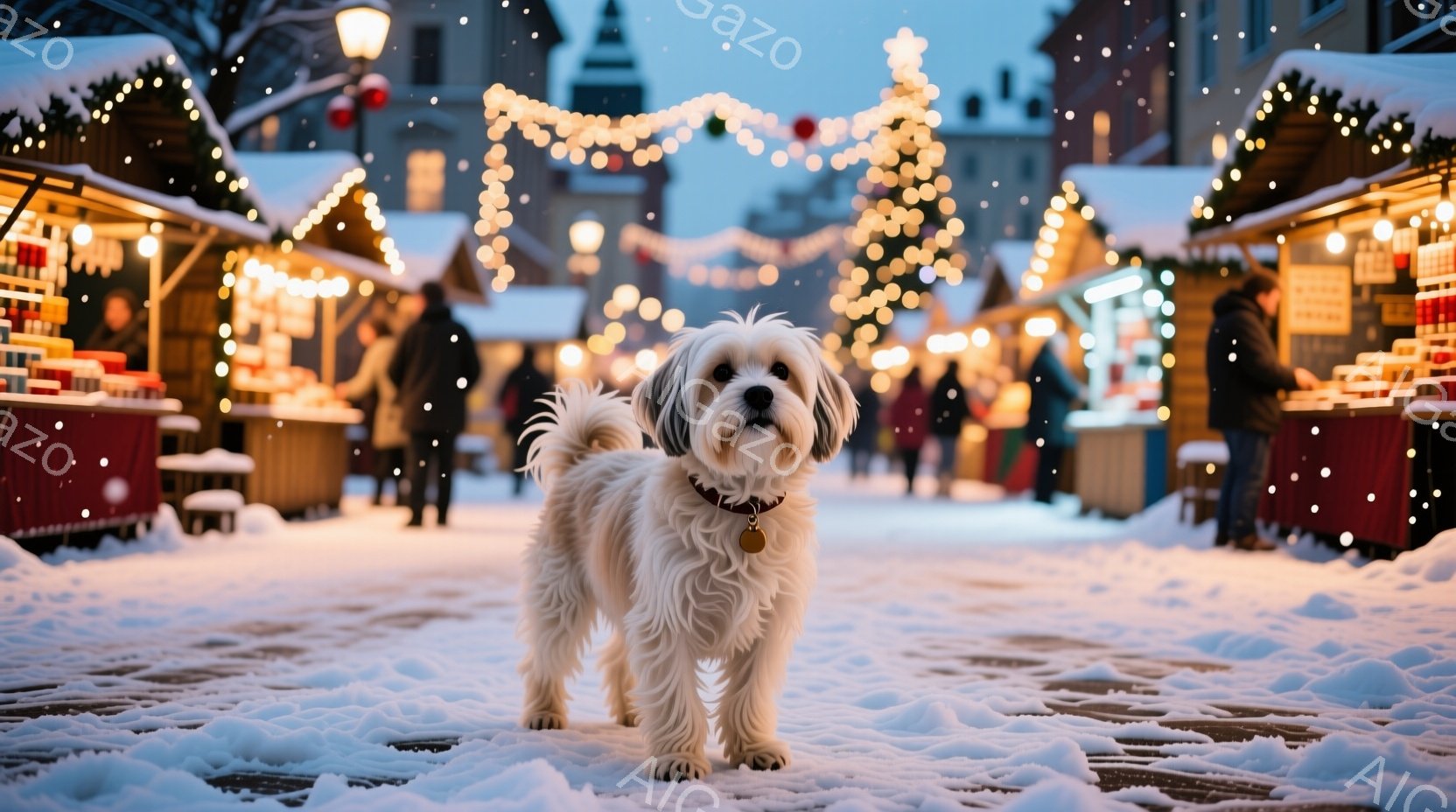 白い毛並みの小型犬が雪に覆われた石畳の道に座っています。背景にはクリスマスマーケットのような賑やかな風景が広がり、多くの人々が暖かな光に包まれた露店の間を歩いています。雪が舞い降りる冬の夜の、温かく幻想的な雰囲気です。