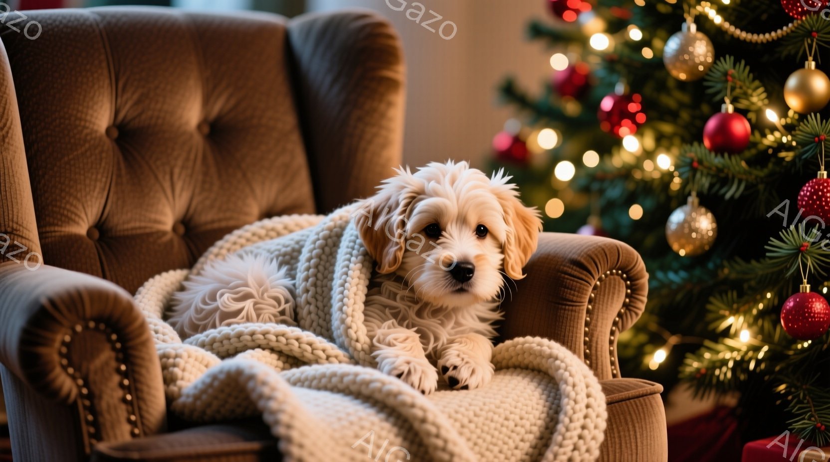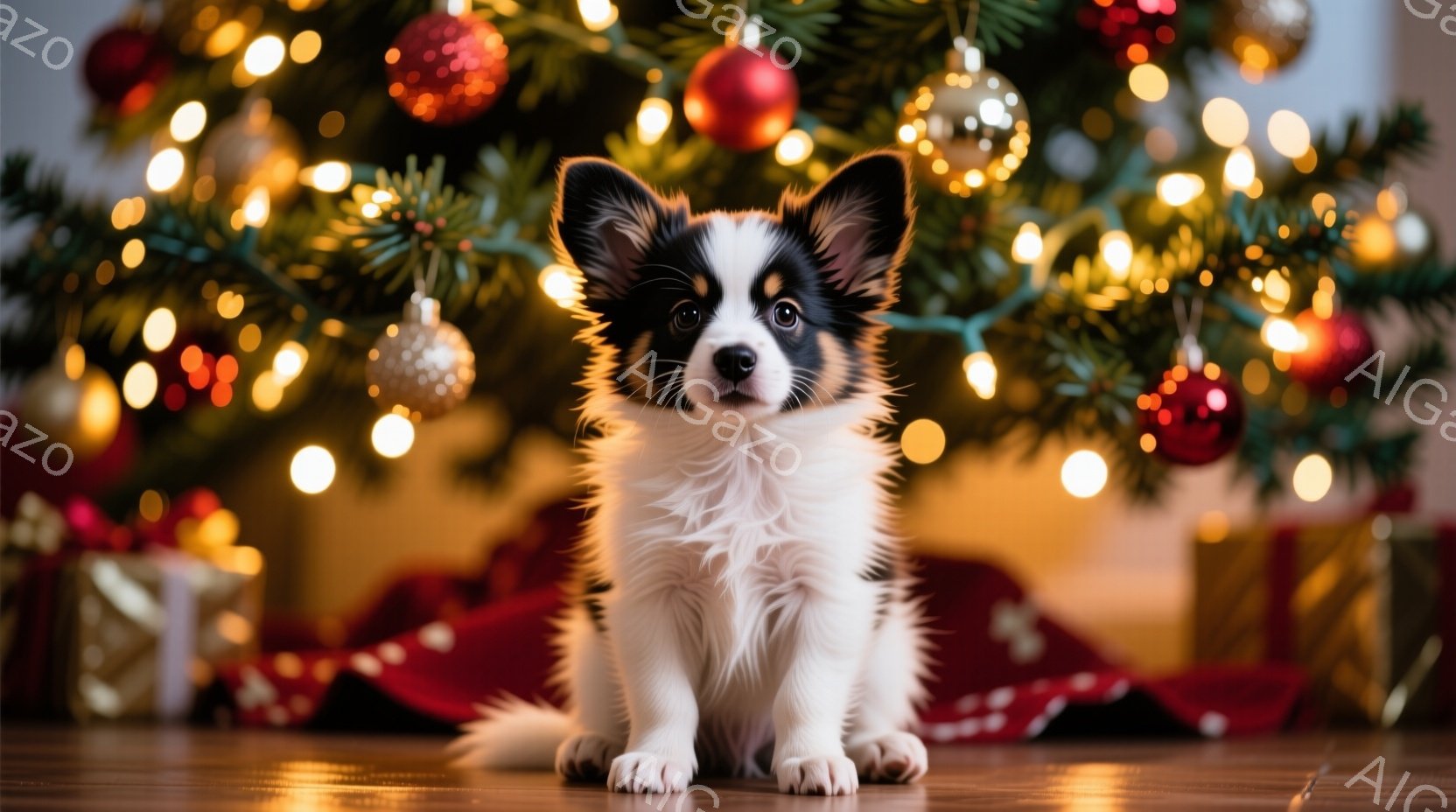 白と黒の毛並みで愛らしいチワワの子犬が、赤い布の上に座って正面を見ています。背景にはクリスマスツリーが飾られ、温かい光で照らされています。全体的に暖かく、お祝いムードに満ちた雰囲気です。