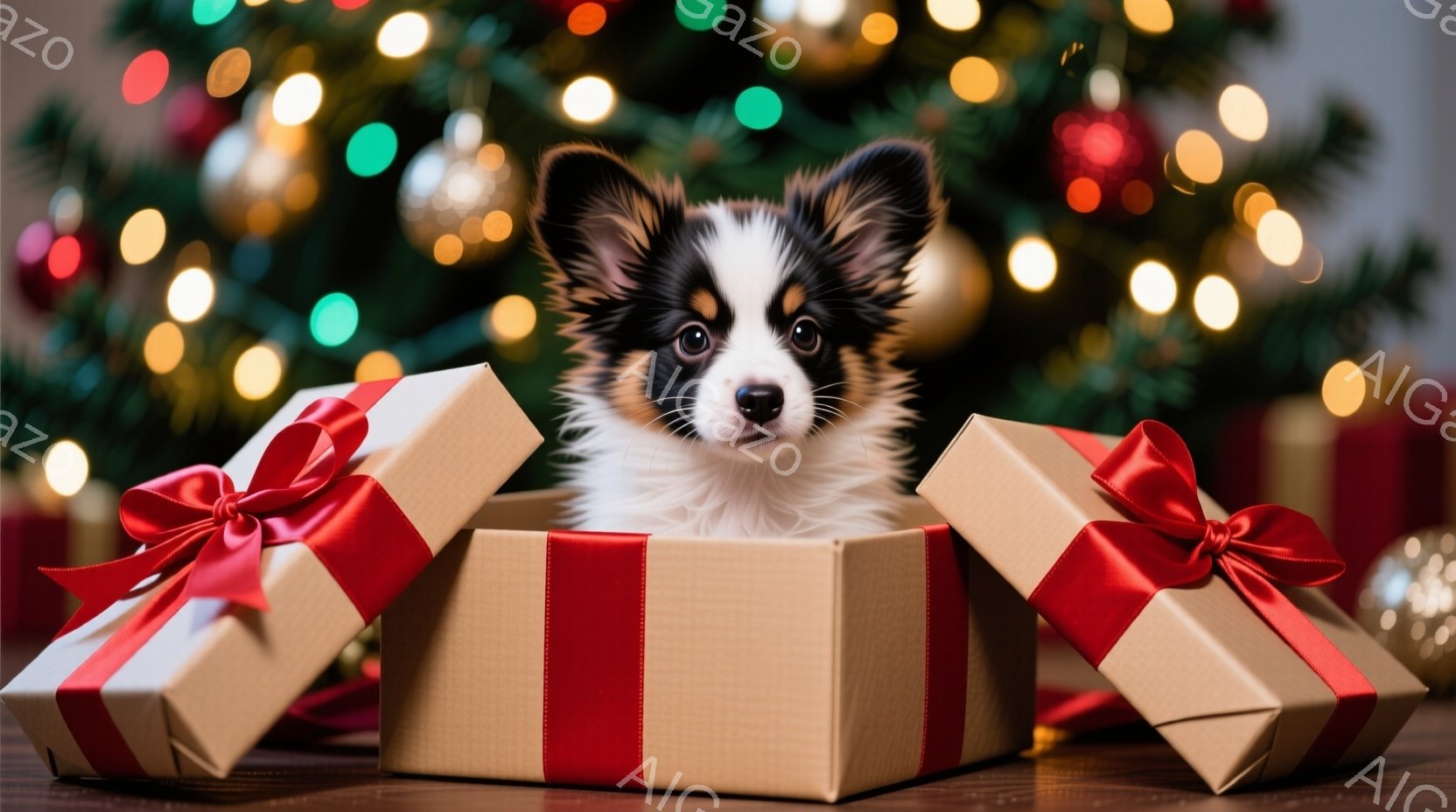 白い毛並みと茶色の斑点を持つ、可愛らしい子犬が赤いリボンで飾られた白いギフトボックスの中に座っています。子犬は前をまっすぐ見て、好奇心とわずかな驚きに満ちた表情をしています。背景には、ぼやけたクリスマスツリーの光と装飾があり、全体的に温かく、お祝いの雰囲気です。