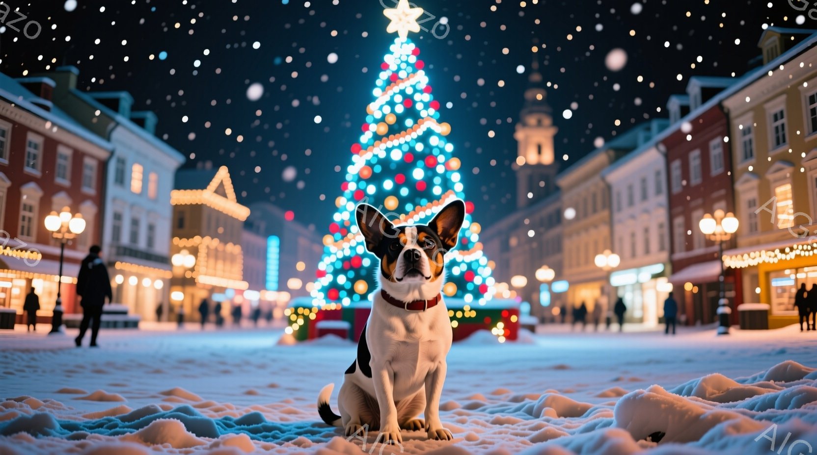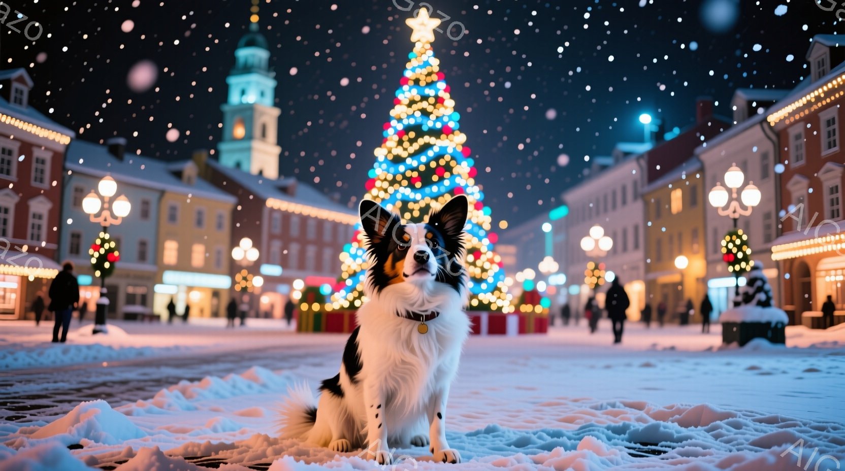 白黒のボーダーコリーが雪に覆われた広場の前に座っており、正面をまっすぐ見ています。背景にはクリスマスツリーが輝き、遠くにはライトアップされた建物が並び、雪が静かに降り積もっています。全体的に温かく、お祝いムードにあふれた冬の光景です。