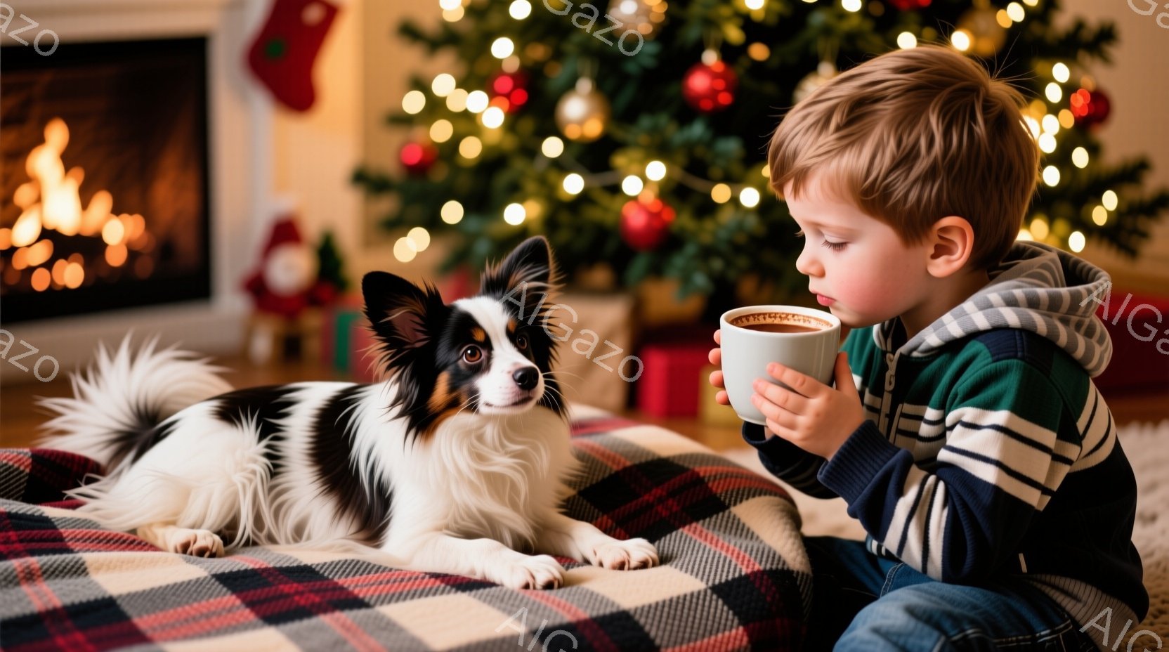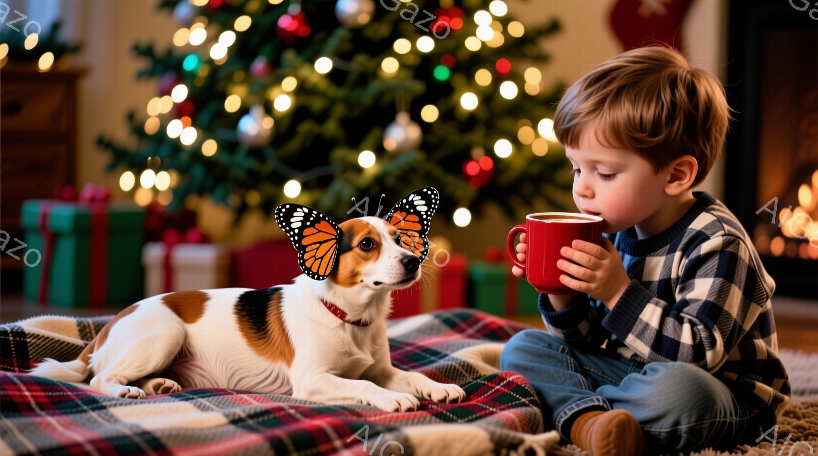 少年はチェック柄の敷物の上で座り、ホットドリンクを飲むためにストローを使ってカップを持っています。そばには、背中に青い蝶が描かれた小さな犬が寄り添っています。背景には、輝くライトとプレゼントで飾られたクリスマスツリーがあり、暖炉の火が見える、暖かく居心地の良い雰囲気の室内です。