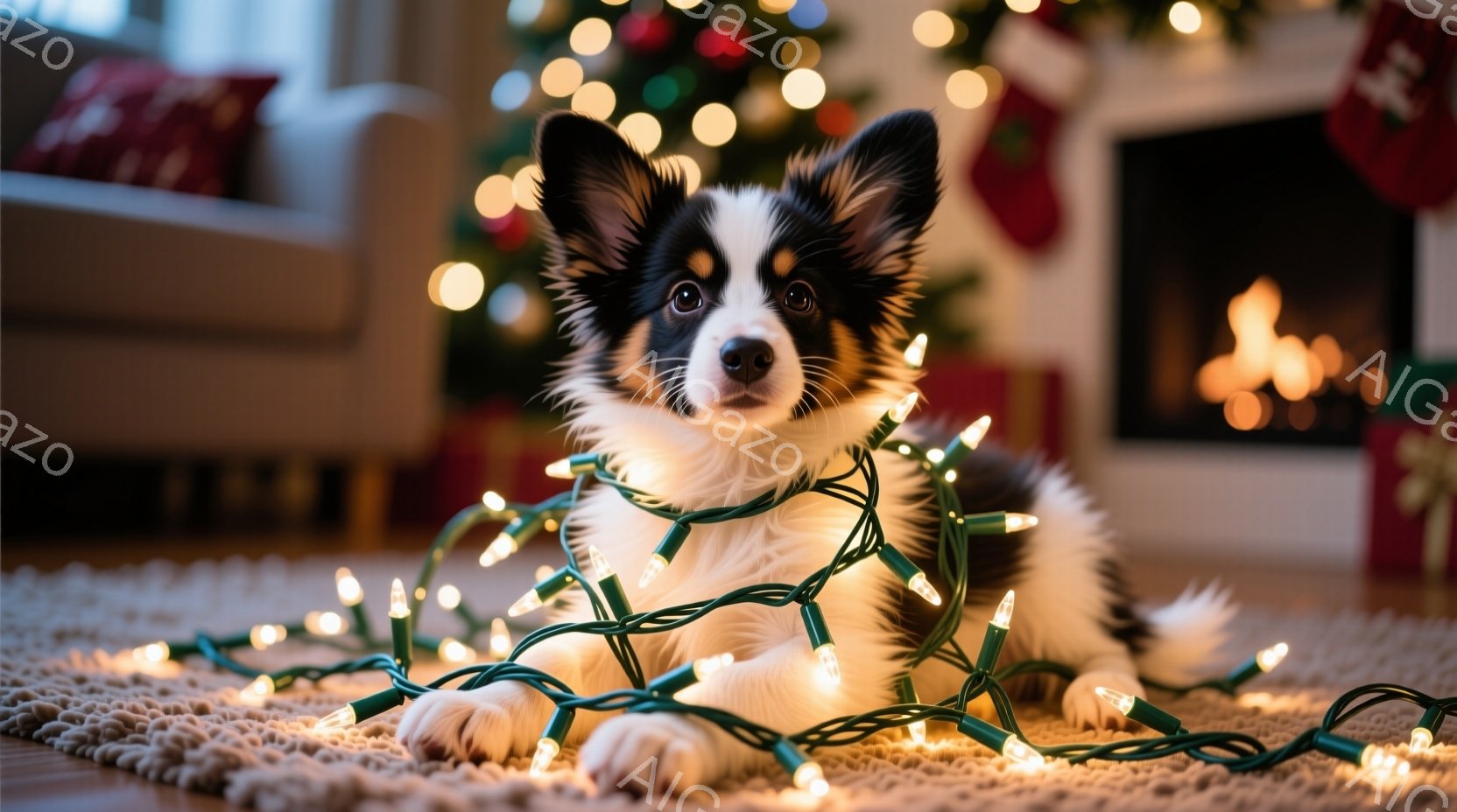 白と黒の毛並みを持つ子犬が、クリスマスツリーのイルミネーションライトに絡まっている様子が写っています。子犬は大きな瞳でカメラを見つめ、遊び心に満ちた表情をしています。背景には、暖炉の火や装飾されたクリスマスツリーが見え、温かく、お祝いムードにあふれた雰囲気です。