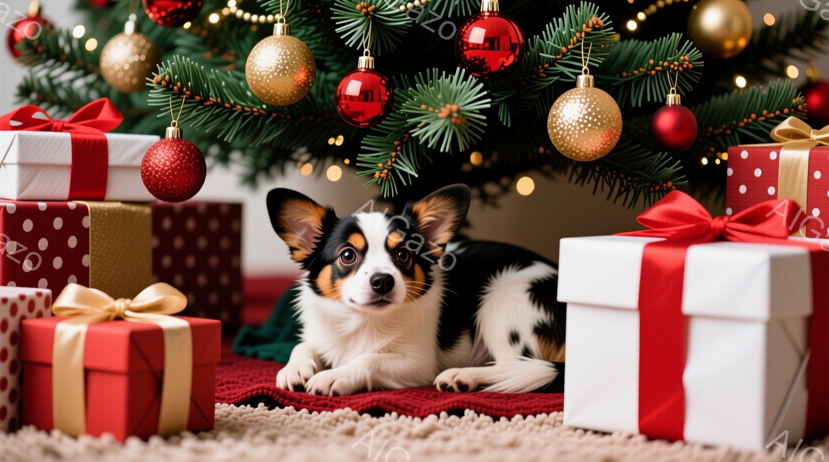 白と黒の毛並みの小さな子犬が、クリスマスツリーの下に積み重ねられたプレゼントの間に横たわっています。プレゼントは赤と緑の包装紙で飾られ、金色のリボンが結ばれています。背景にはぼやけたクリスマスツリーの飾りが見え、暖かく幸せなクリスマスの雰囲気が漂っています。