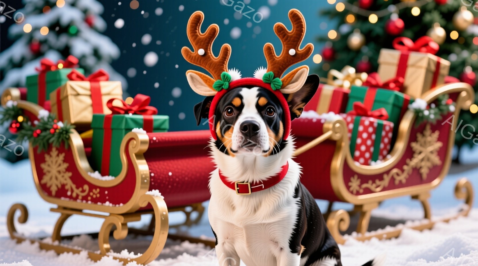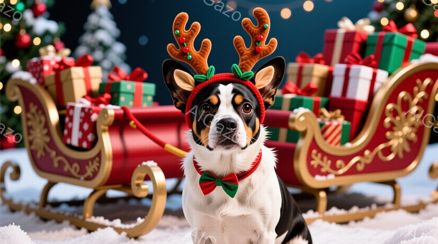 白と黒の犬が、赤いトナカイの角の頭飾りをつけて正面を見つめています。背景には、プレゼントの箱が積み上げられ、赤いそりが雪の上に置かれています。全体的に、クリスマスの祝祭的な雰囲気が漂っており、暖かく幸せな気分になります。