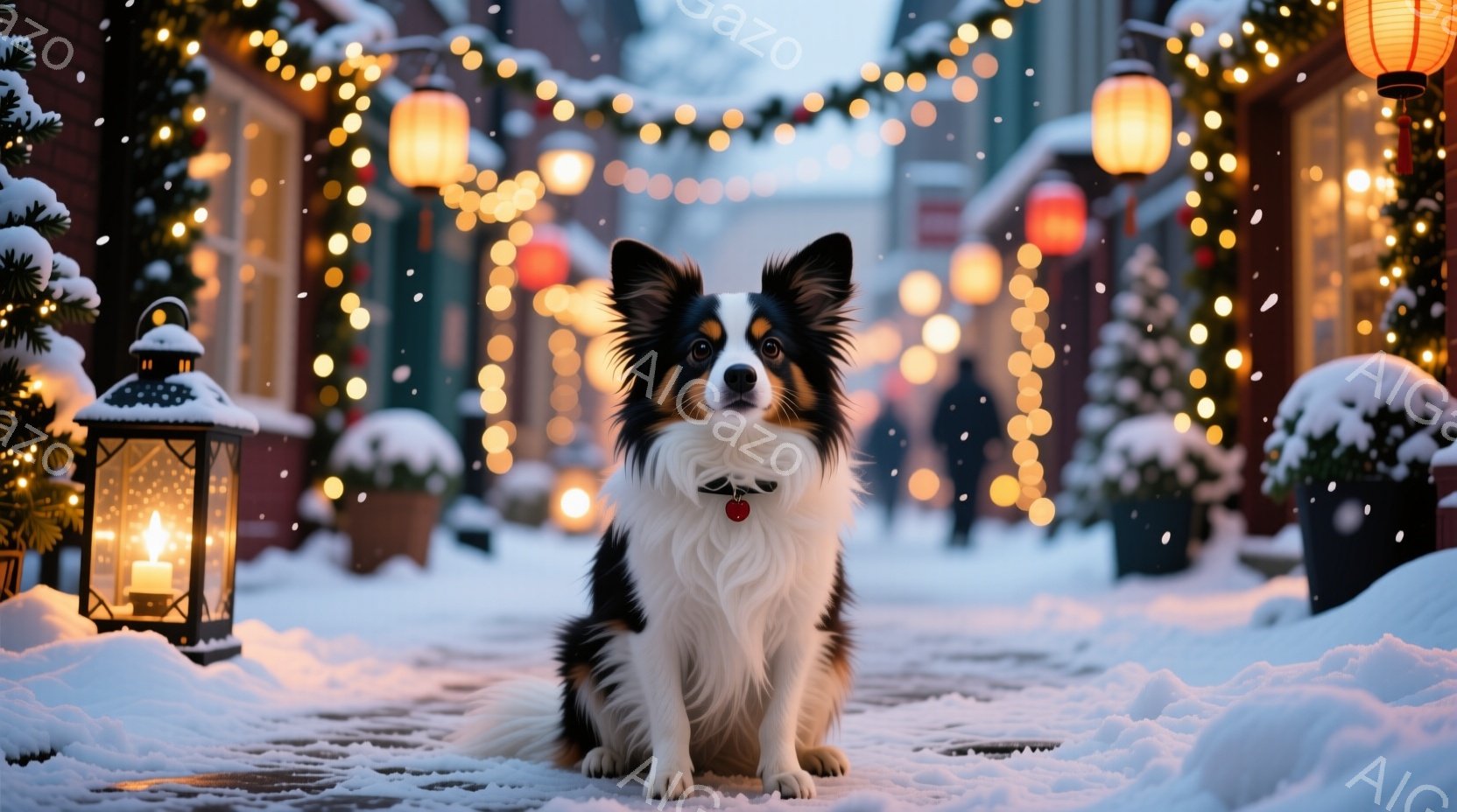 白と黒の毛並みに茶色のアクセントが入った、美しいボーダーコリーが雪に覆われた石畳の道に座っています。背景には、キラキラと輝く電飾と、ぼんやりと見える人影があり、冬の暖かいお祭りのような雰囲気を醸し出しています。雪が舞い、全体的に幻想的で穏やかな印象を与えます。