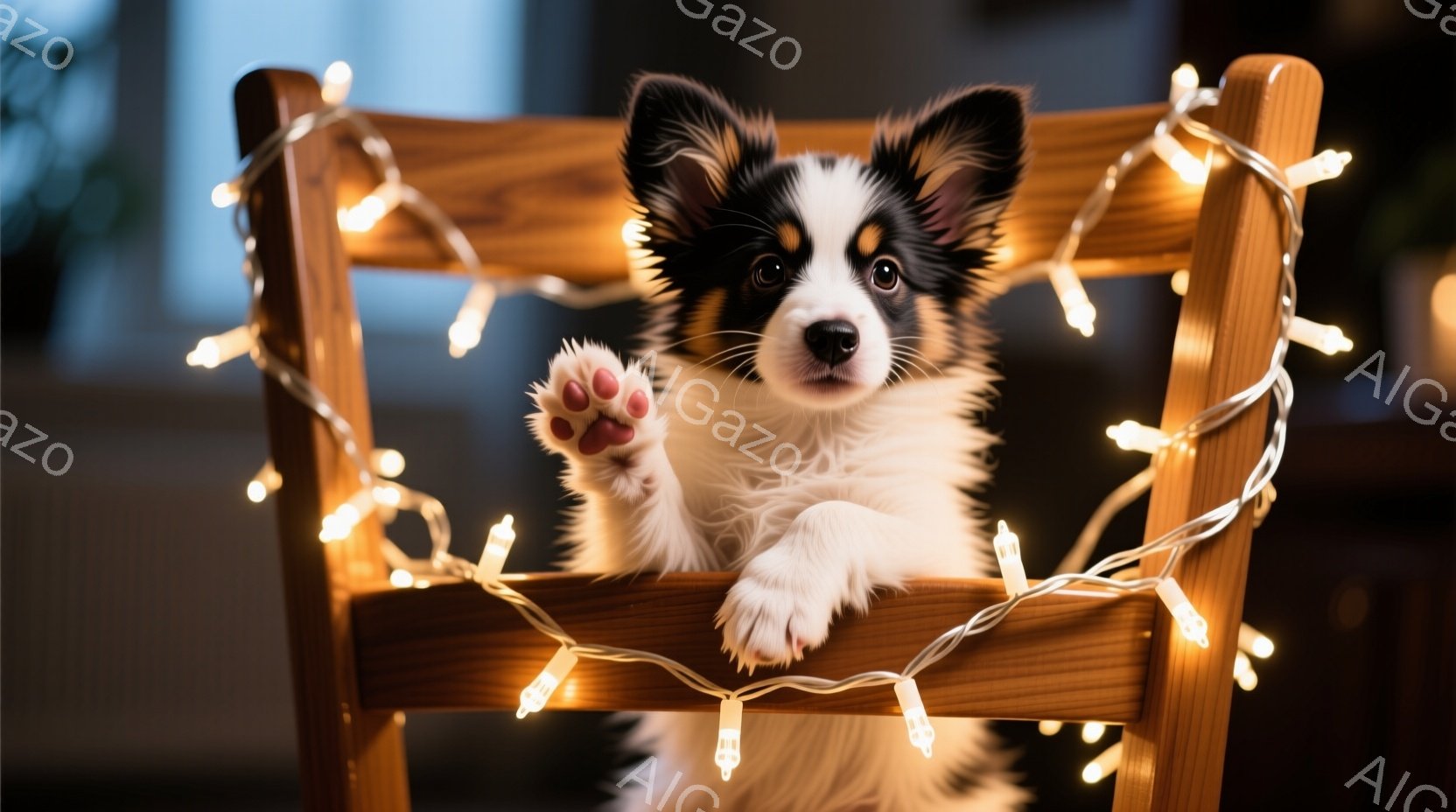 白と茶色の毛並みの小さな子犬が、クリスマスツリー用の電飾で飾られた木の椅子の背もたれから顔を出し、片手を伸ばしています。子犬は好奇心と遊び心に満ちた表情で、カメラを見つめています。背景には暖色の照明とぼやけた家具が見え、温かく心地よい雰囲気を醸し出しています。