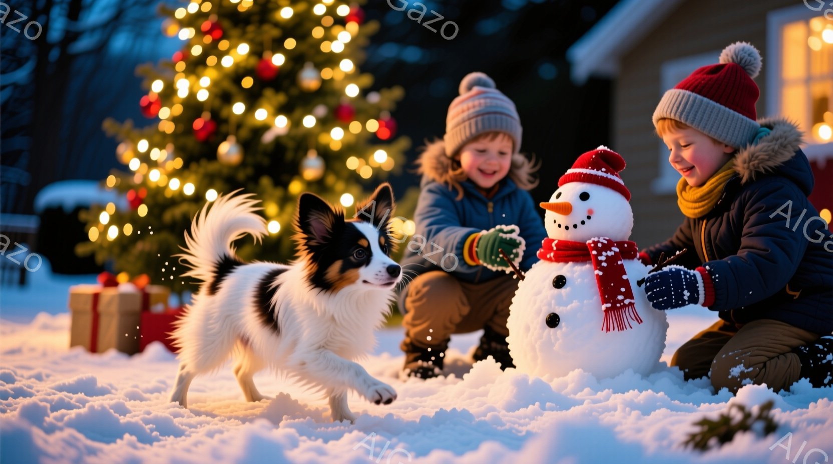 雪景色の中で、赤い帽子をかぶった女の子二人が雪だるまを作っています。片方の女の子は明るい笑顔で雪だるまの顔を飾り付け、もう片方は嬉しそうに駆け寄る犬と遊んでいます。背景には、クリスマスツリーの光が輝き、プレゼントの箱が散らばる暖かく幸せな冬の光景が広がっています。