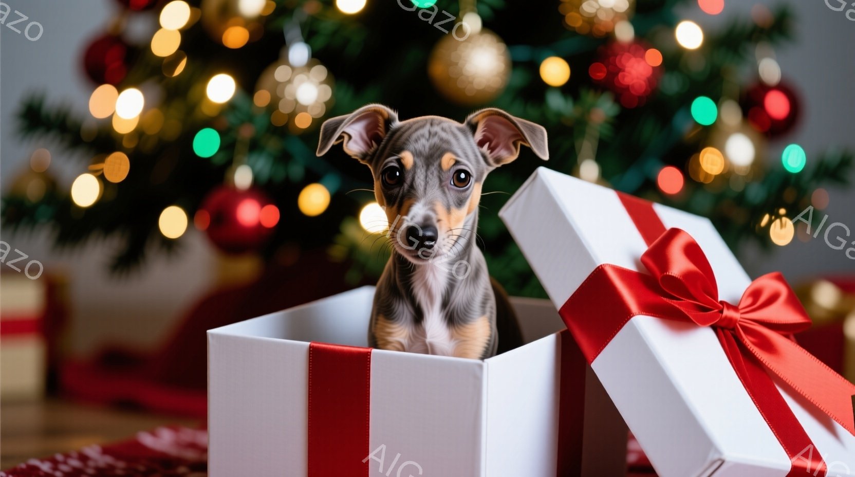 白いギフトボックスの中から、毛並みの美しい子犬が顔を出しています。子犬は明るい茶色の瞳でカメラを見つめ、少し緊張しながらも好奇心旺盛な表情をしています。背景にはぼやけたクリスマスツリーの光が輝き、暖かくお祝いムードに包まれた様子が伝わってきます。