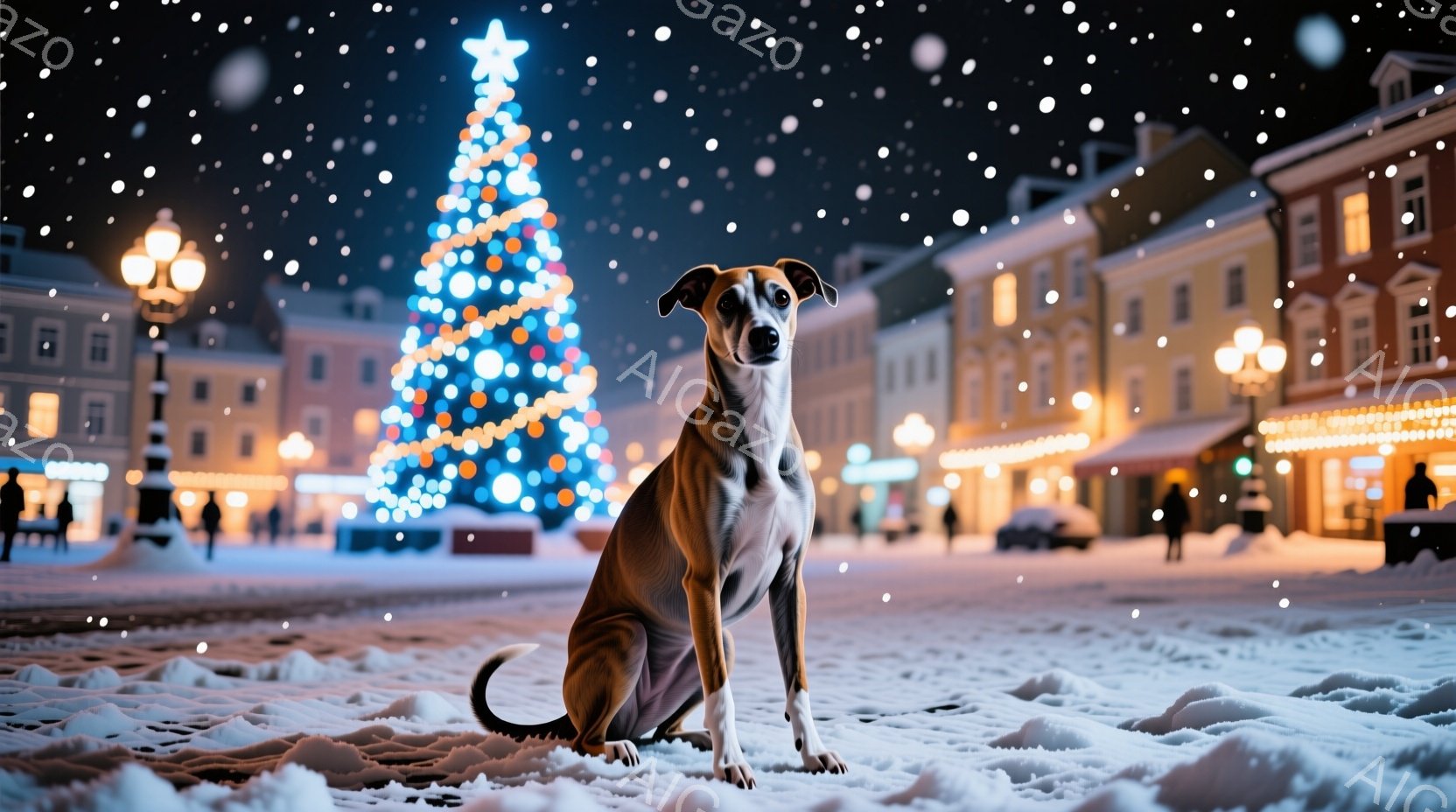 白い雪に覆われた広場に、茶色の短毛の愛犬が座っています。背景には、カラフルなイルミネーションで飾られた大きなクリスマスツリーが聳え立ち、遠くには雪景色の中に建物が見えます。全体的に穏やかで温かい雰囲気で、冬の夜の静けさと祝祭の喜びを感じさせます。
