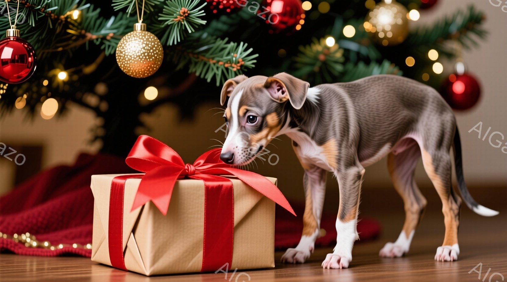 小さな子犬が白いプレゼントボックスの前に立っています。子犬はグレーと茶色の毛並みで、好奇心と少しの緊張が混ざった表情でプレゼントを見つめています。背景にはクリスマスツリーが飾り付けられており、赤いカーペットの上にプレゼントが置かれ、温かくお祝いムードが漂っています。