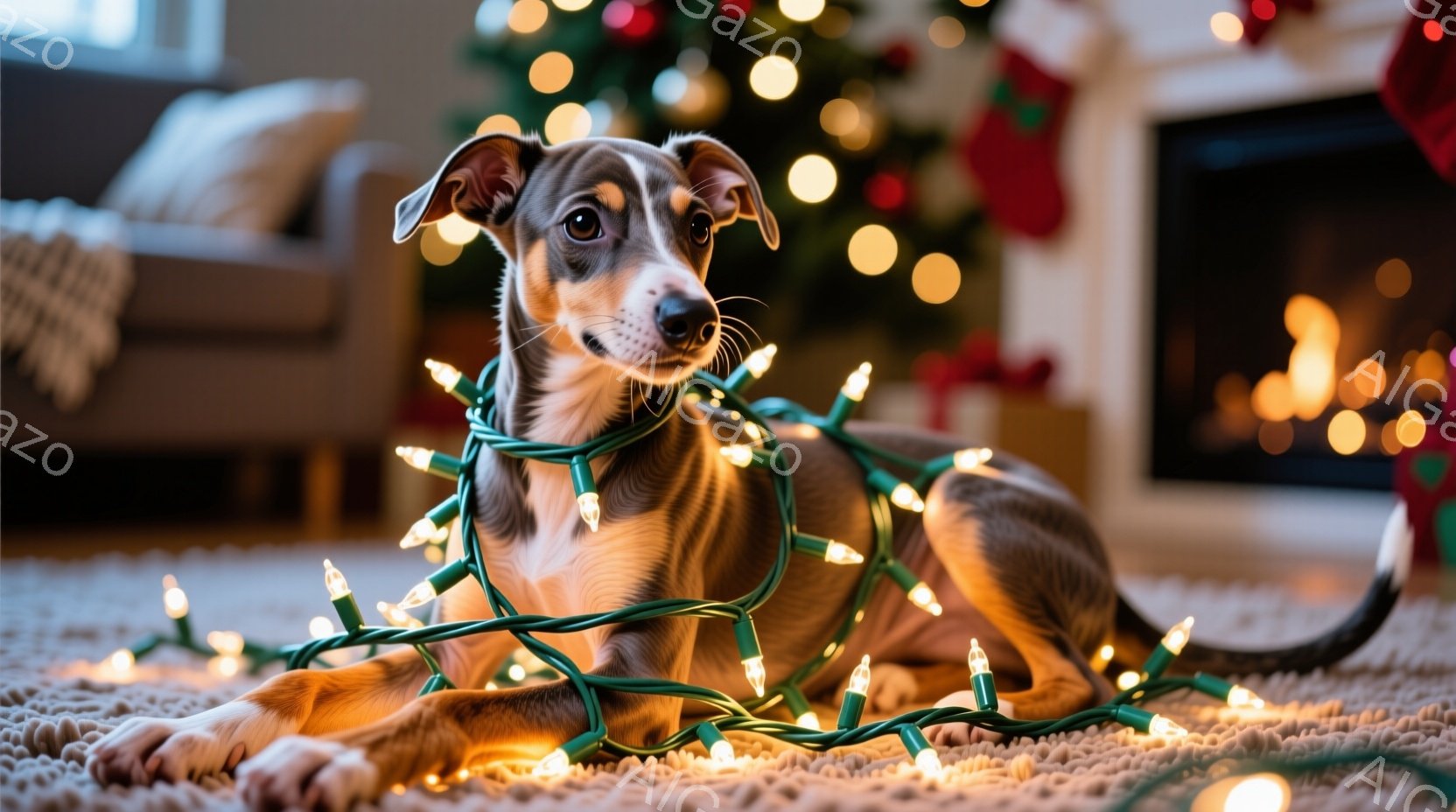 雪景色の中に、優雅な姿のグレイハウンドが立っている。背景にはクリスマスツリーが飾られており、暖色の電飾が雪景色に温かみを与えている。全体的に静かで幻想的な雰囲気が漂い、冬の穏やかな休日を描写している。