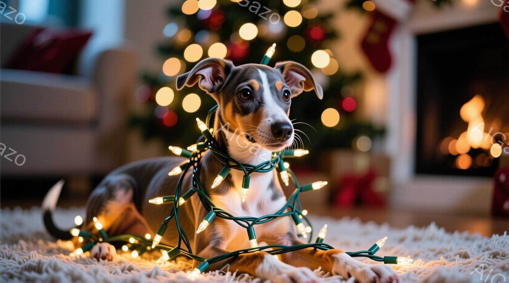 クリスマスツリーの足元に、灰色の毛並みのイタグレが横たわっています。その周りには、赤とベージュの大きなギフトボックスが置かれ、赤い敷物が敷かれています。背景には、輝くオーナメントで飾られた緑のクリスマスツリーがぼんやりと見え、温かくお祝いの雰囲気を醸し出しています。