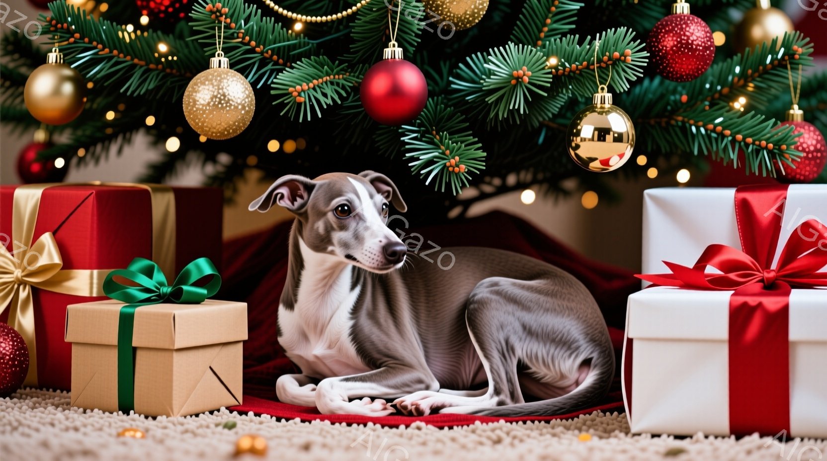 暖炉の前に敷かれた赤い布の上に、プレゼントの箱に囲まれて犬が横たわっています。犬は茶色と白の毛並みで、リラックスした表情でカメラを見つめています。背景にはクリスマスツリーが飾られ、キラキラとした光が暖かく、お祝いの雰囲気を演出しています。