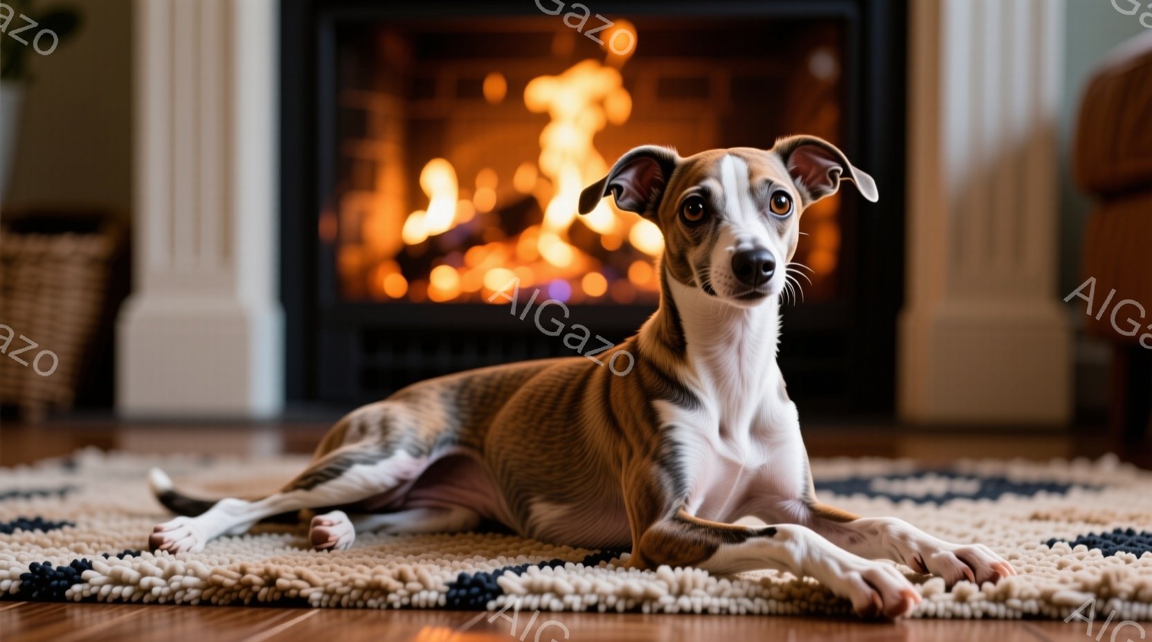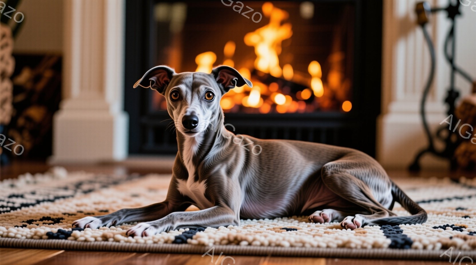 縞模様のグレイハウンドが、明るい色のラグの上に横たわっています。その表情は穏やかで、カメラに向かって少しだけ視線を送っています。背景には暖炉があり、炎が燃えており、室内は温かく、リラックスした雰囲気が漂っています。