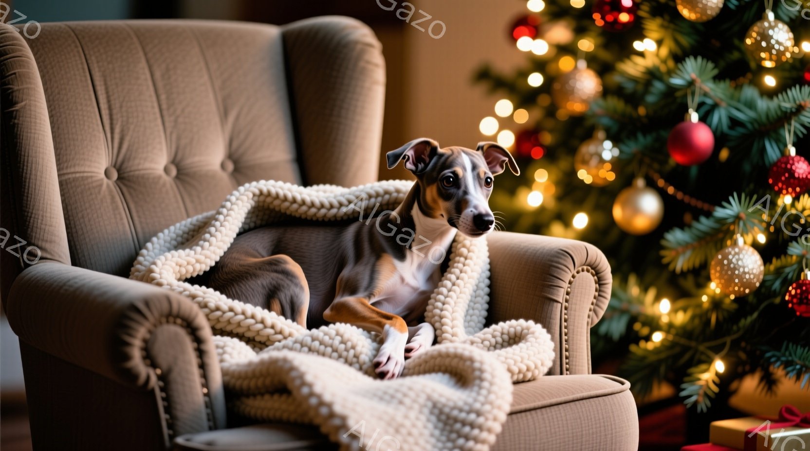 ベージュ色の肘掛け椅子に、毛布にくるまってリラックスした表情の茶色い犬が座っています。背景には、オーナメントで飾られたクリスマスツリーと、プレゼントボックスがぼやけて見え、暖かく居心地の良い雰囲気を醸し出しています。犬はまるで自分の椅子を手に入れたかのように、穏やかにくつろいでいます。