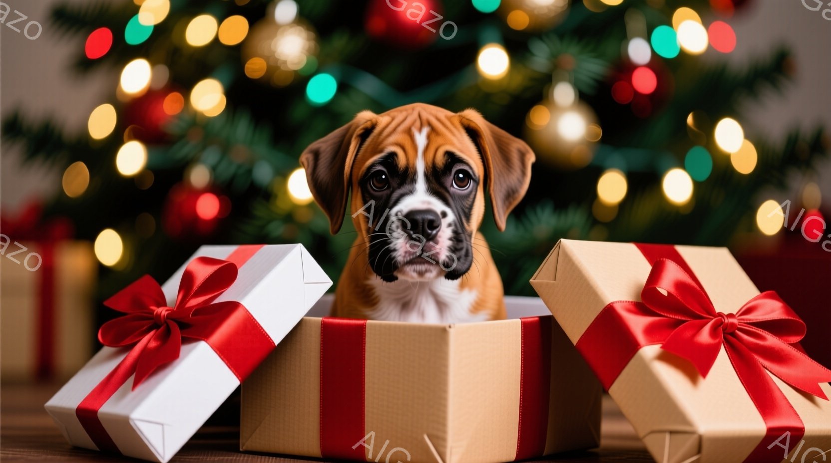 可愛らしいボックス犬の子犬が、水玉模様の白いギフトボックスに座っています。背景には、ぼやけたクリスマスツリーの光が輝き、温かくお祝いムードを演出しています。プレゼントのリボンと箱が、さらに季節感を高めています。