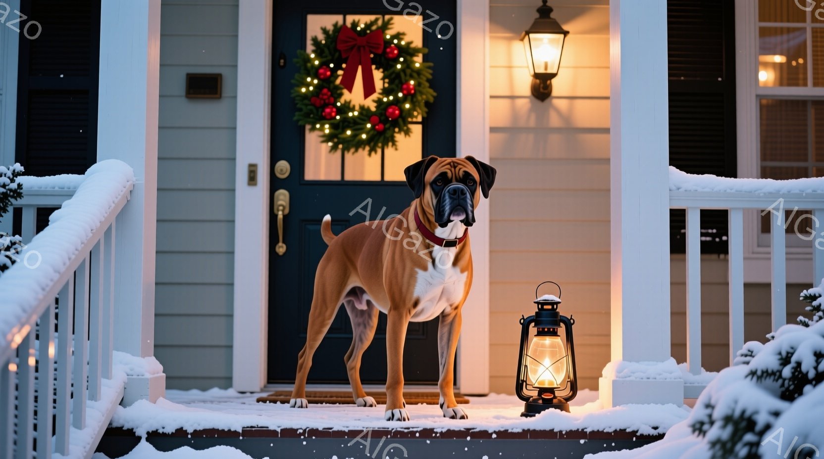 白い雪に覆われた家の階段に、茶色と白のボクサー犬が立っている。犬は赤い首輪をつけ、正面を見て落ち着いた表情をしている。背景には、クリスマスリースが飾られたドアと、灯りのついたランタンがあり、冬の穏やかで温かい雰囲気を醸し出している。