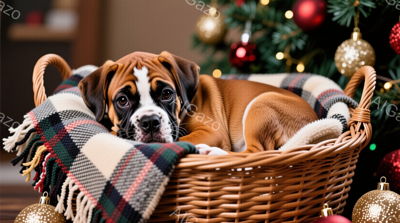 籠の中に2匹のボクサーの子犬が寄り添って眠っている。子犬たちは茶色と白の毛並みで、それぞれ特徴的な顔の模様を持っている。背景にはクリスマスツリーとオーナメントが飾られ、暖かくお祝いムードが漂っている。