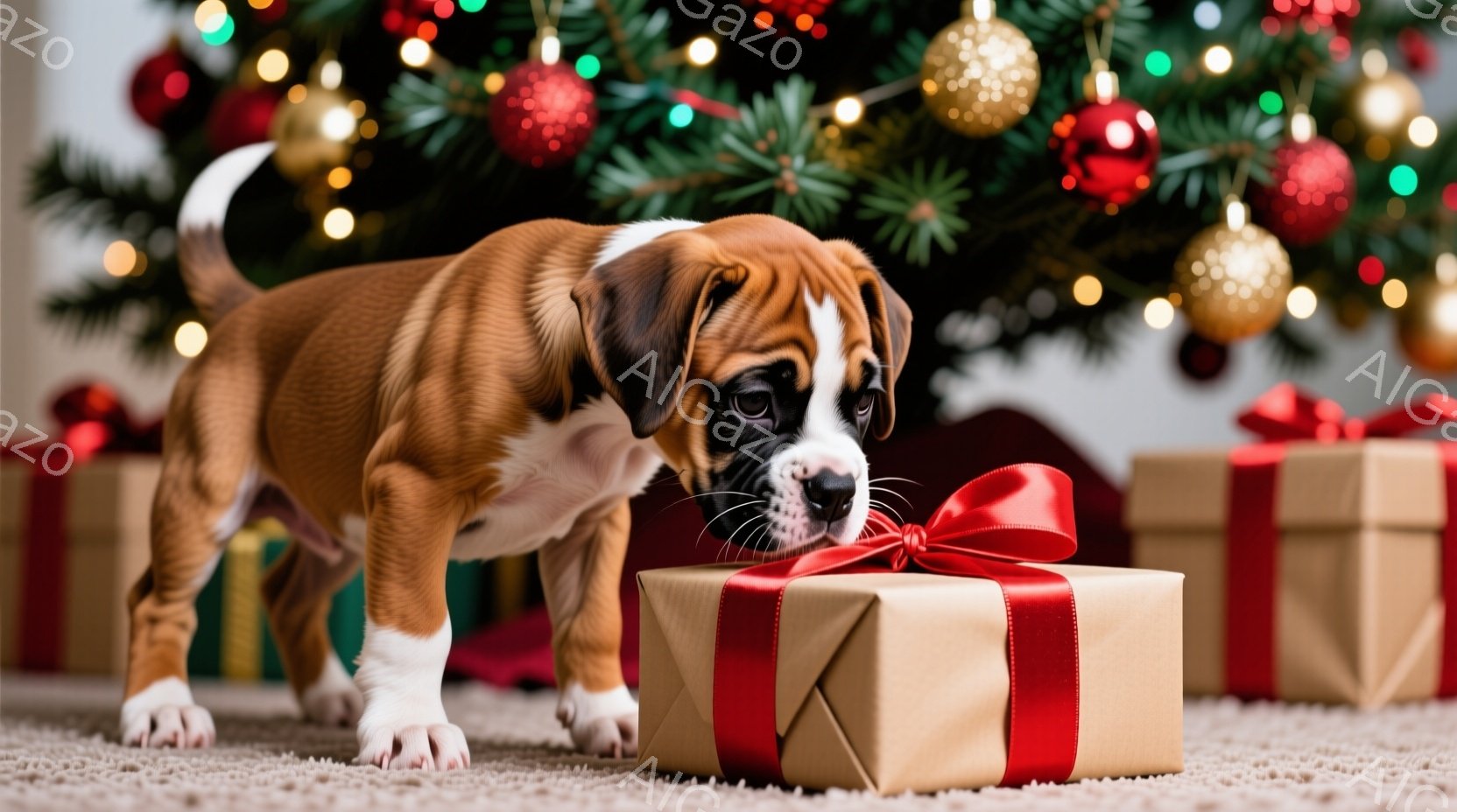 赤茶色のパピーが、赤いリボンで飾られたプレゼントの箱を嗅ぎ見しています。背景にはクリスマスツリーが飾られ、緑と金色のオーナメントが輝き、赤い布が敷かれています。全体的に暖かく、お祝いムードにあふれたクリスマスの雰囲気です。