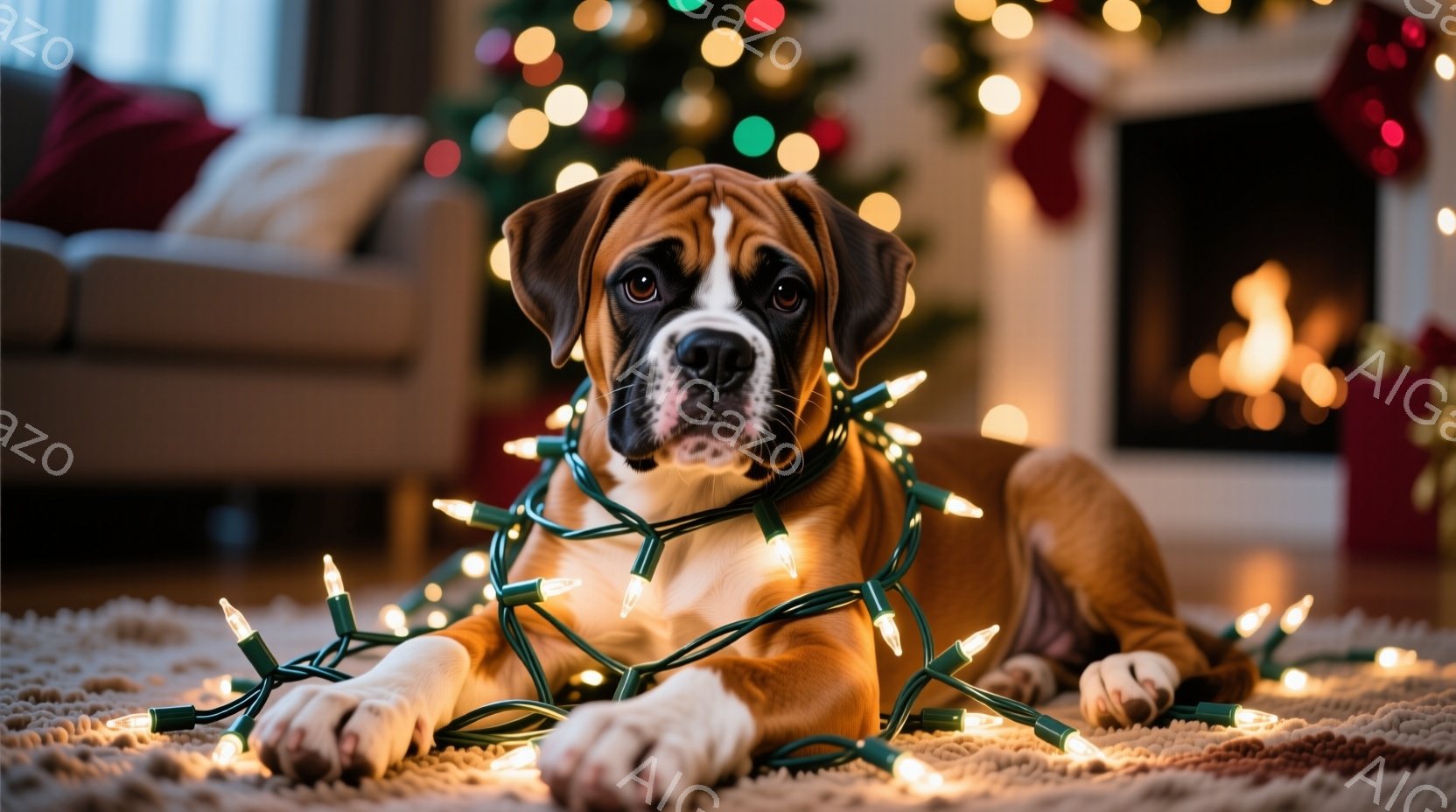 暖炉とクリスマスツリーが背景に見える室内で、茶色のパピーがクリスマスライトにくるまれて床に横たわっています。パピーは少し困ったような、または退屈そうな表情でカメラを見ています。背景は暖かく、お祝いの雰囲気が漂っており、パピーの愛らしい姿と相まって、心温まる光景です。