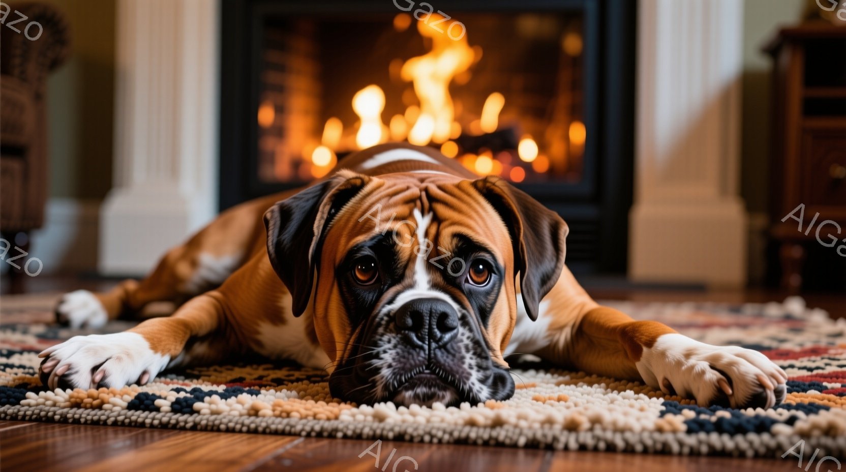 暖炉のそばに赤いクリスマスストッキングが飾られ、その中に子犬が顔を出しています。子犬は茶色と白の毛並みで、好奇心と少しばかりの困惑が入り混じった表情をしています。背景には、キラキラと輝くクリスマスツリーの飾りと、暖炉の炎が暖かく照らし出す、穏やかで祝祭的な雰囲気です。