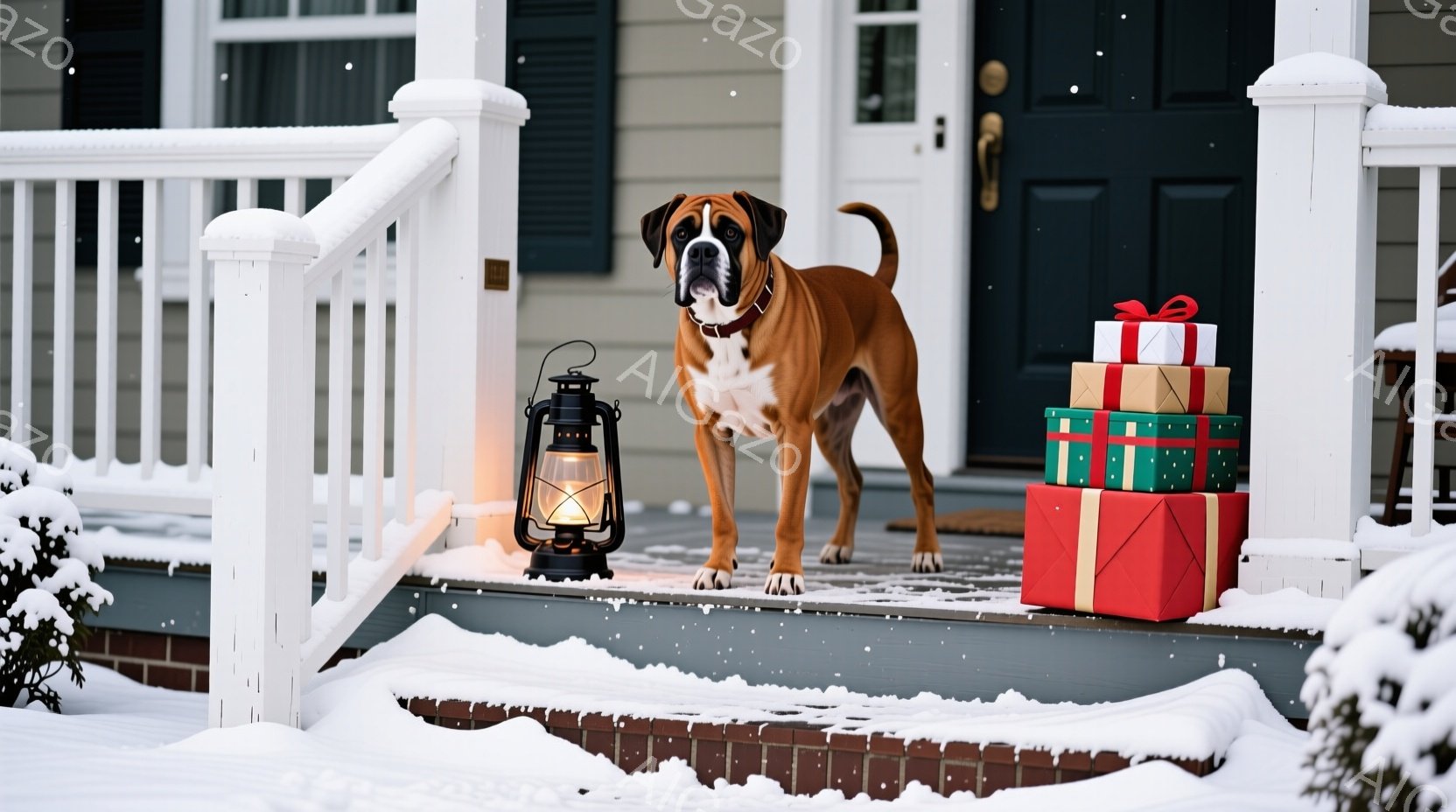 白い毛並みと茶色の斑点を持つボクサー犬が、雪で覆われた家の階段に立っている。犬は赤い首輪を付け、まっすぐ前を見て、警戒しているような表情をしている。背景には、クリスマス飾り付きの玄関ドアと、雪に覆われた階段、そして温かい光を放つランタンが見え、全体的に冬の暖かく穏やかな雰囲気を醸し出している。