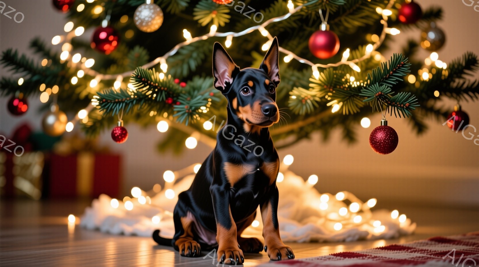 黒と茶色の毛並みを持つ子犬が、クリスマスツリーの下に座っています。ツリーは明るい電飾で飾られ、白いフリースのような敷物が敷かれています。全体的に暖かく、お祝いの雰囲気で、子犬の大きな瞳が観客に寄り添うように見つめています。