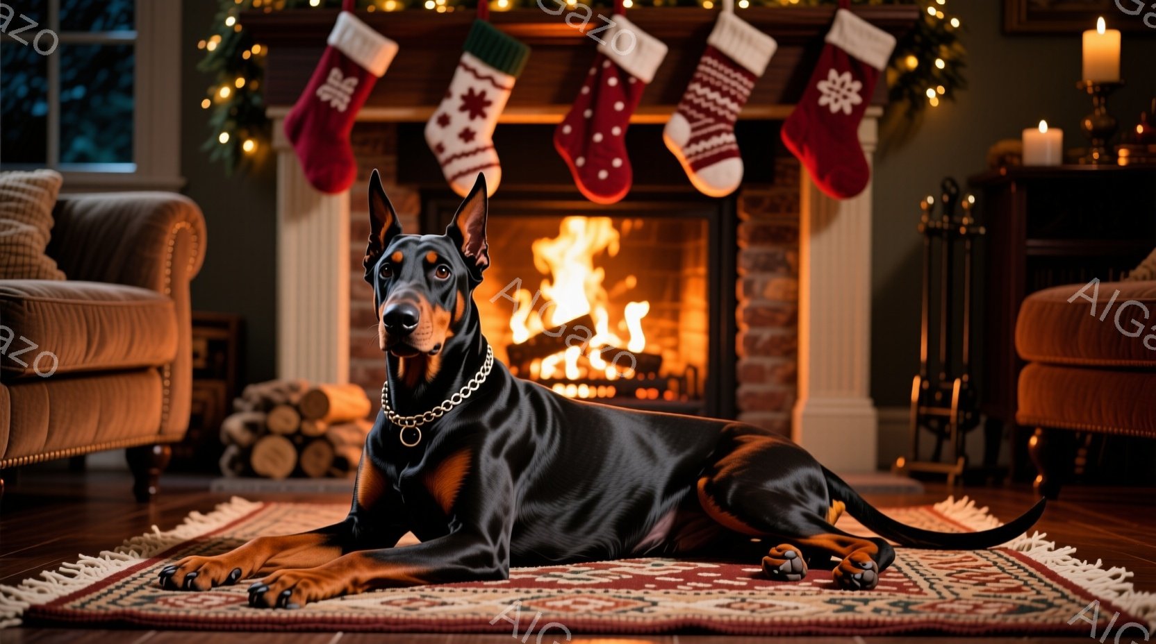 黒く光沢のあるドーベルマンが、カラフルな模様のラグの上にリラックスして横たわっています。暖炉の炎が暖かく照らし、背景にはクリスマスストッキングが飾られています。部屋は温かく居心地の良い雰囲気で、まるで家族の温かいクリスマスを表現しているかのようです。