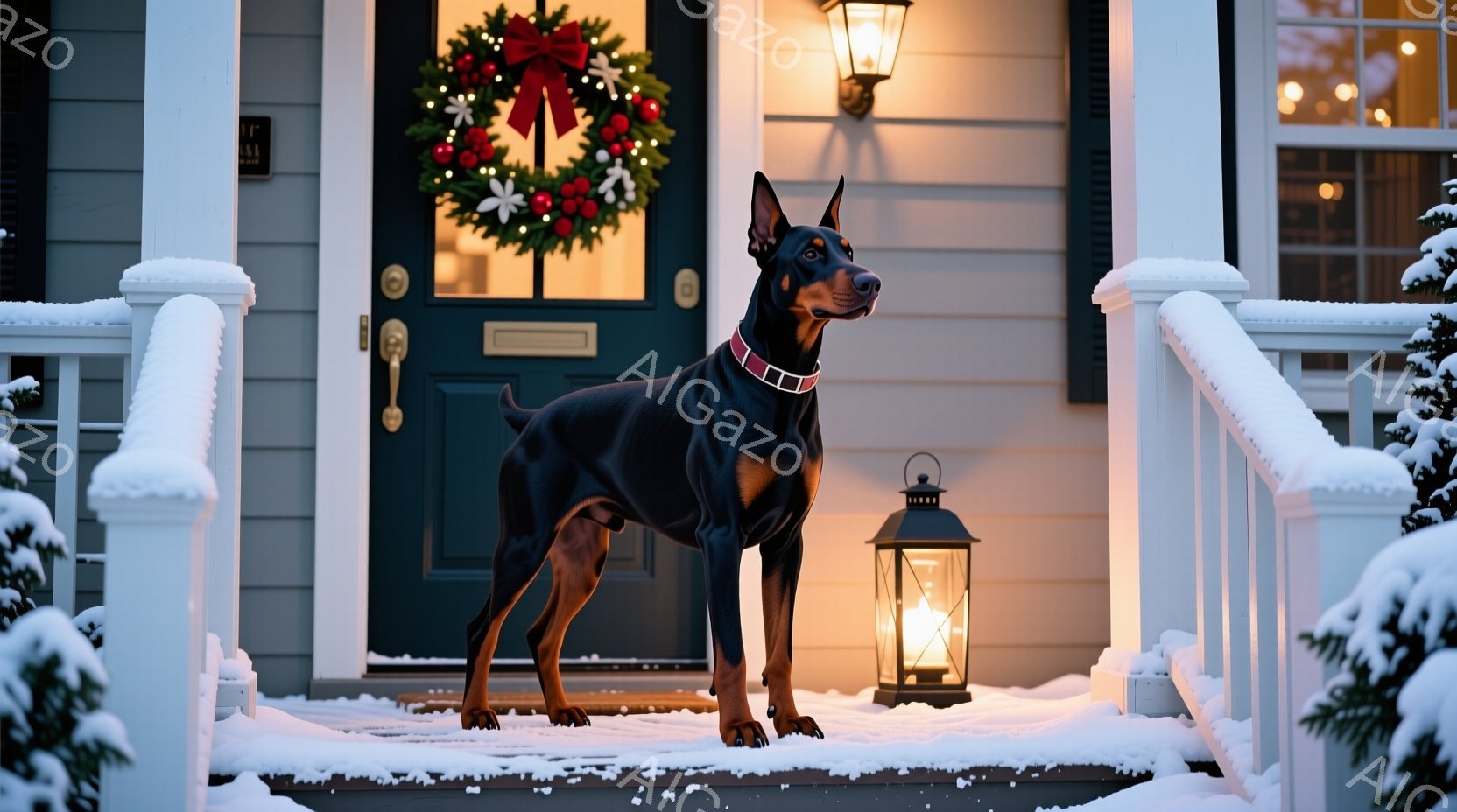 黒いドーベルマン犬が雪の中を活発に飛び跳ねています。頭にはサンタクロースの帽子をかぶり、喜びと興奮に満ちた表情で、雪が舞う冬の景色を楽しんでいる様子が伺えます。背景にはクリスマスツリーが飾られ、雪景色と相まって、温かく幸せなホリデーシーズンを象徴しています。