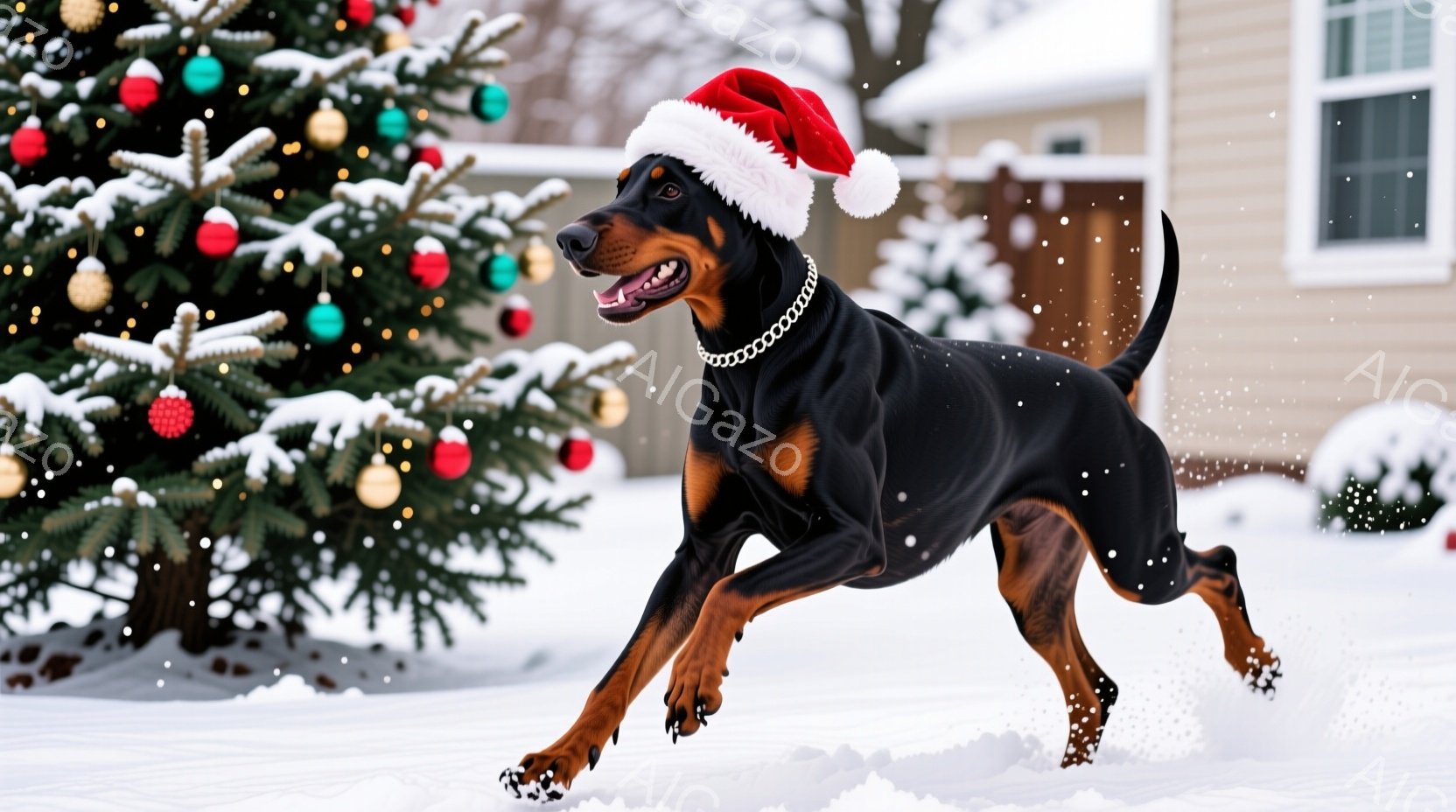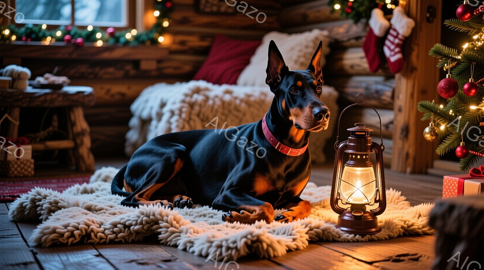 黒いドーベルマン犬が白い毛皮のようなラグの上に横たわっています。背景には暖炉があり、クリスマスの装飾が施された部屋全体が温かく、居心地の良い雰囲気を醸し出しています。ランプが犬の隣に置かれ、暖炉の火が部屋を照らしています。