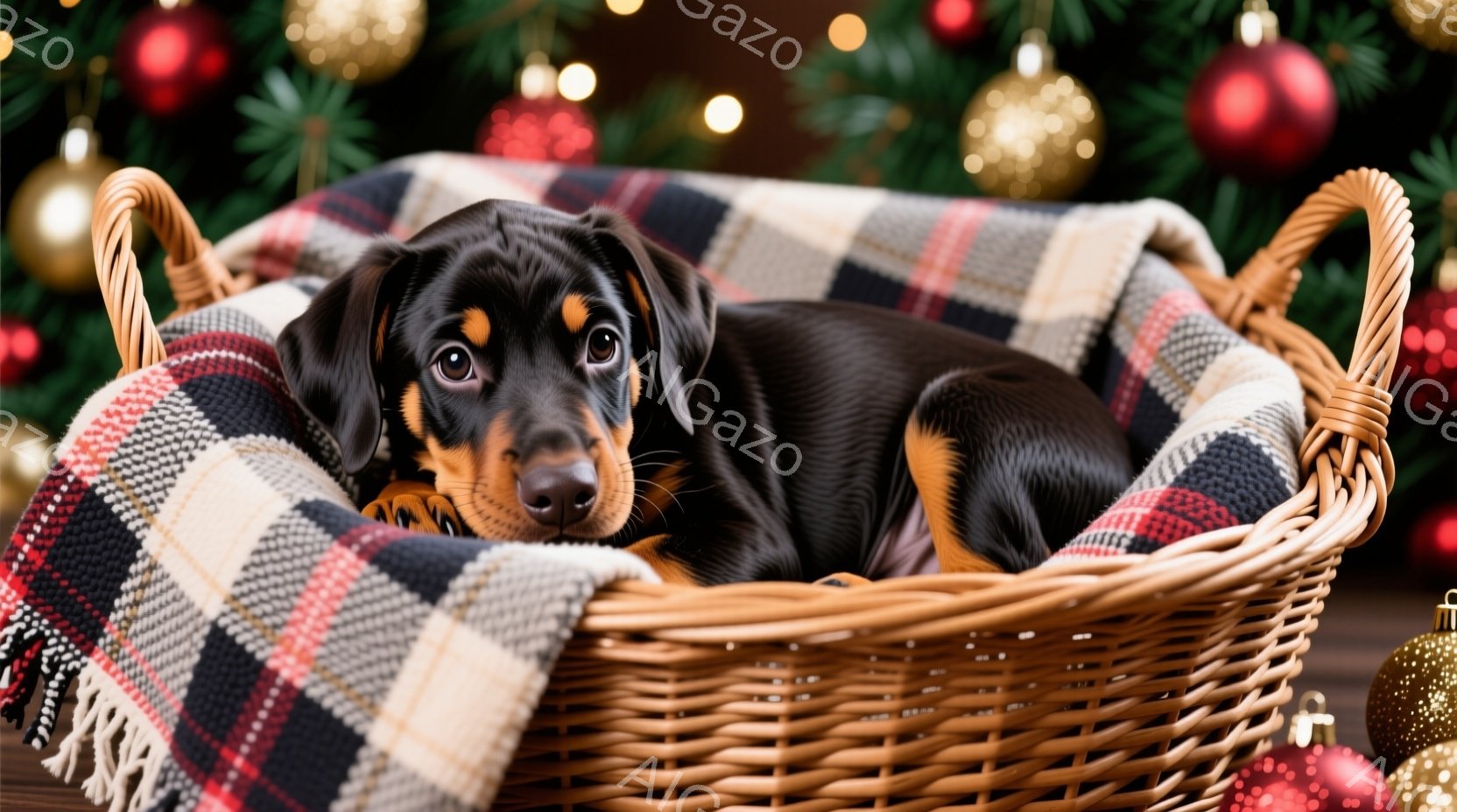 籐編みのバスケットの中に、黒と茶色の毛並みを持つ子犬が横たわっています。子犬はチェック柄のブランケットに頭を預け、穏やかな表情でこちらを見つめており、リラックスした様子が伺えます。背景にはクリスマスツリーと輝くオーナメントがぼやけ、温かく、お祝いムードに満ちた雰囲気が漂っています。