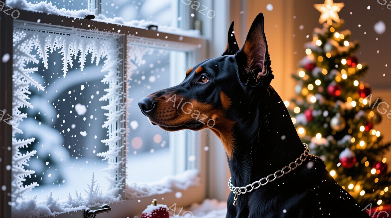 窓の外の雪景色を眺めるドーベルマンが描かれています。黒い毛並みと茶色の斑点を持つ犬は、金属製の首輪をつけ、少し物憂げな表情で遠くを見つめています。背景にはクリスマスツリーが飾られ、室内は温かく、雪が舞う冬の静けさを感じさせる光景です。
