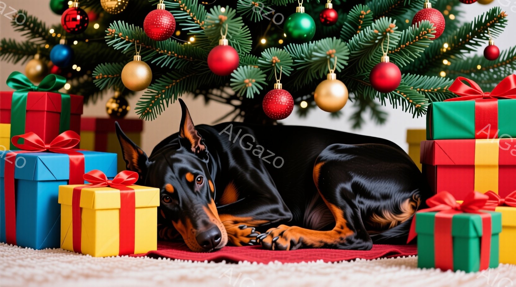 黒いドーベルマンが、クリスマスツリーの下、プレゼントの山の中で横たわっています。プレゼントは赤、青、緑、黄色と様々な色で、リボンで飾られています。背景にはぼんやりとクリスマスツリーの緑と装飾が見え、暖かくお祝いの雰囲気が漂っています。