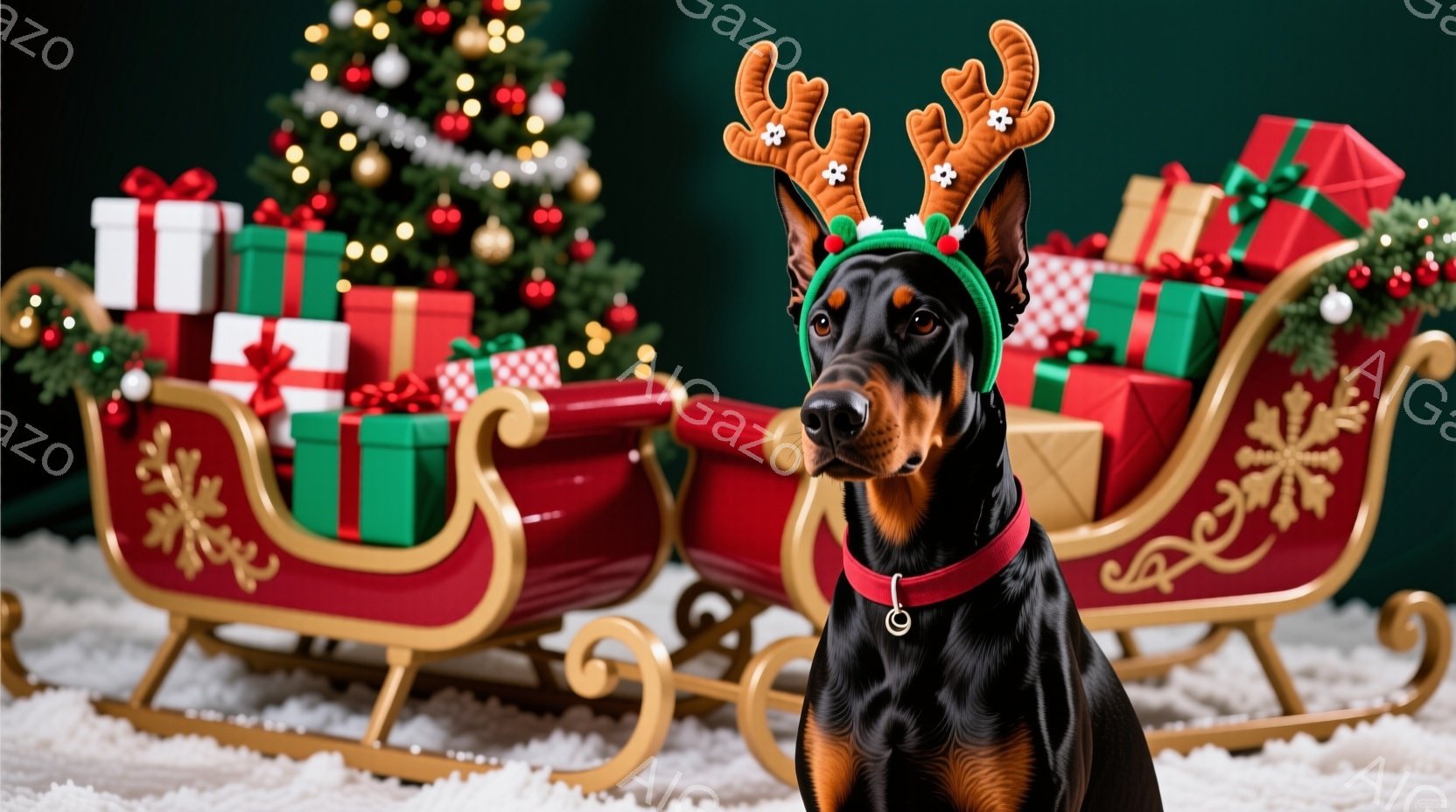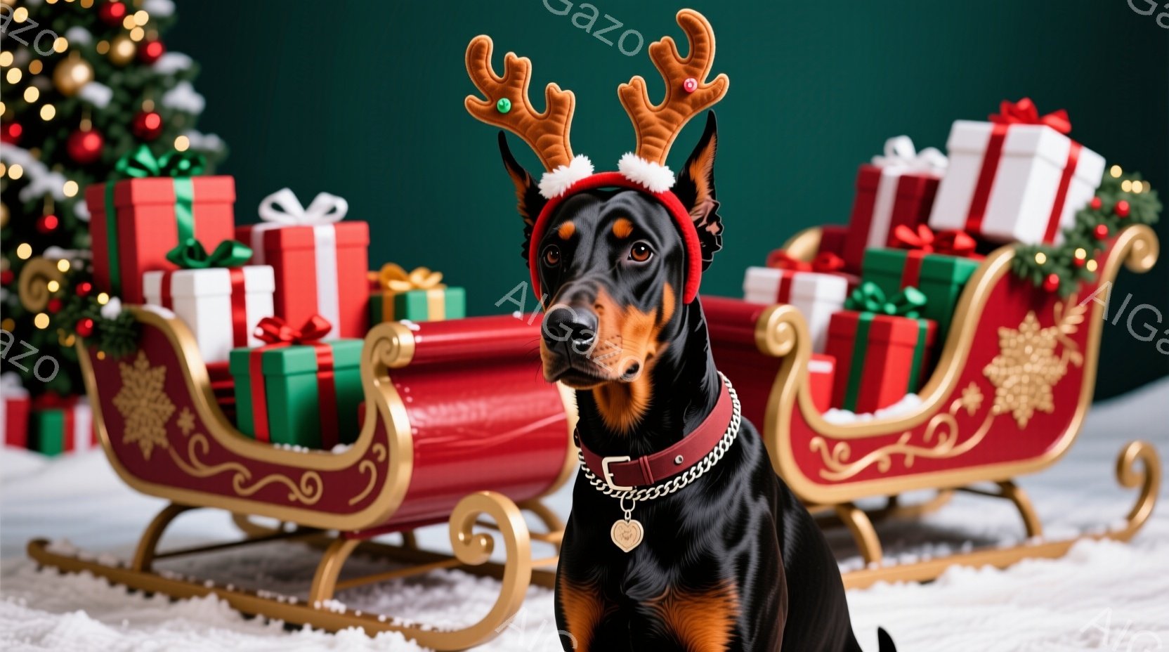 ドーベルマンがクリスマスの角の頭飾りと首輪をつけて、雪景色の中で座っています。背景にはプレゼントが積み込まれた赤いそり、そしてぼやけたクリスマスツリーの光が見えます。全体的に温かく、お祝いムードにあふれた雰囲気です。