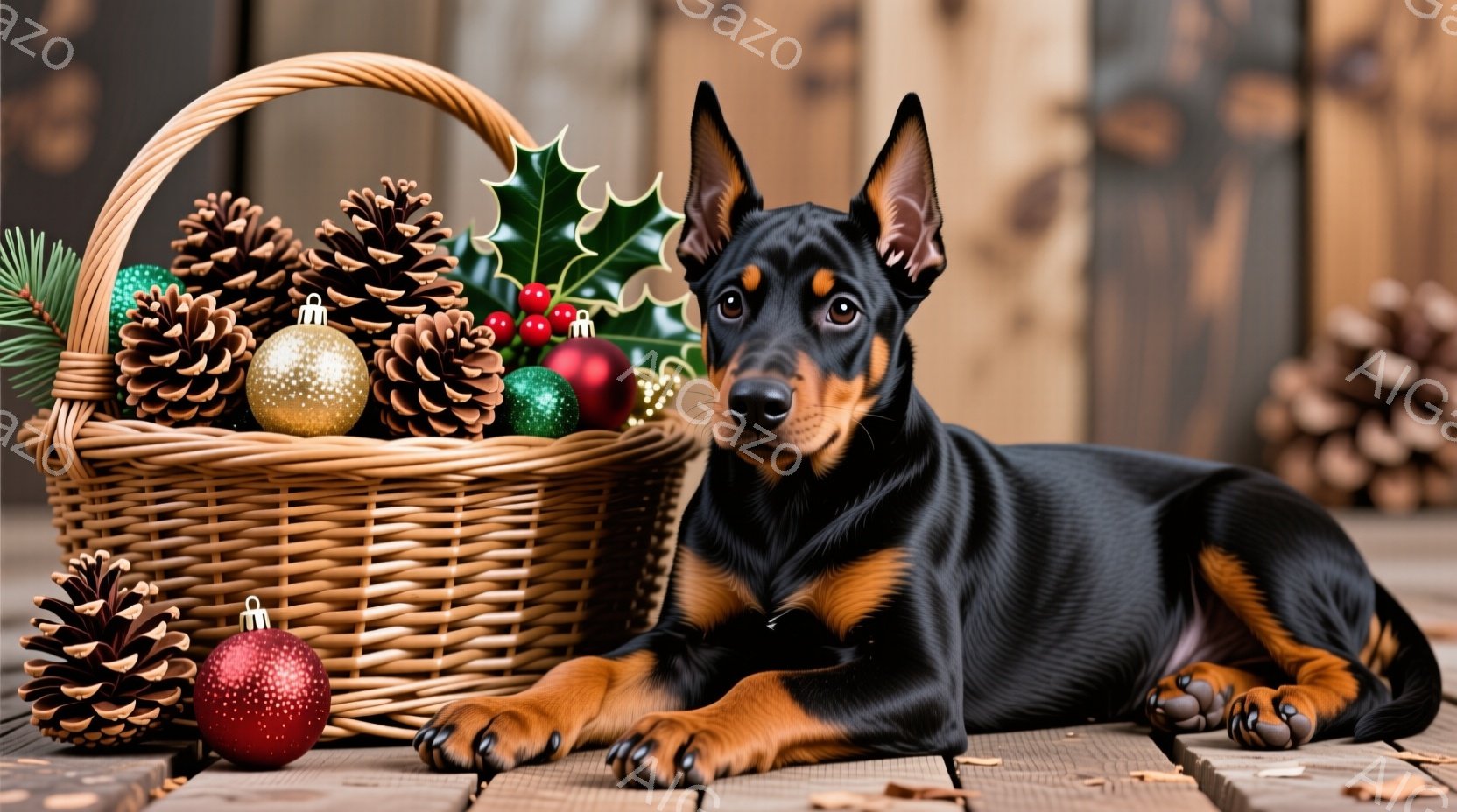 黒と焦げ茶色のダックスフントが、クリスマスオーナメントや松ぼっくりが入った籐のバスケットの横に横たわっています。犬はリラックスした表情で、前足を伸ばし、カメラの方を見ています。背景には木製の床があり、全体的に暖かく、クリスマスの雰囲気が漂っています。