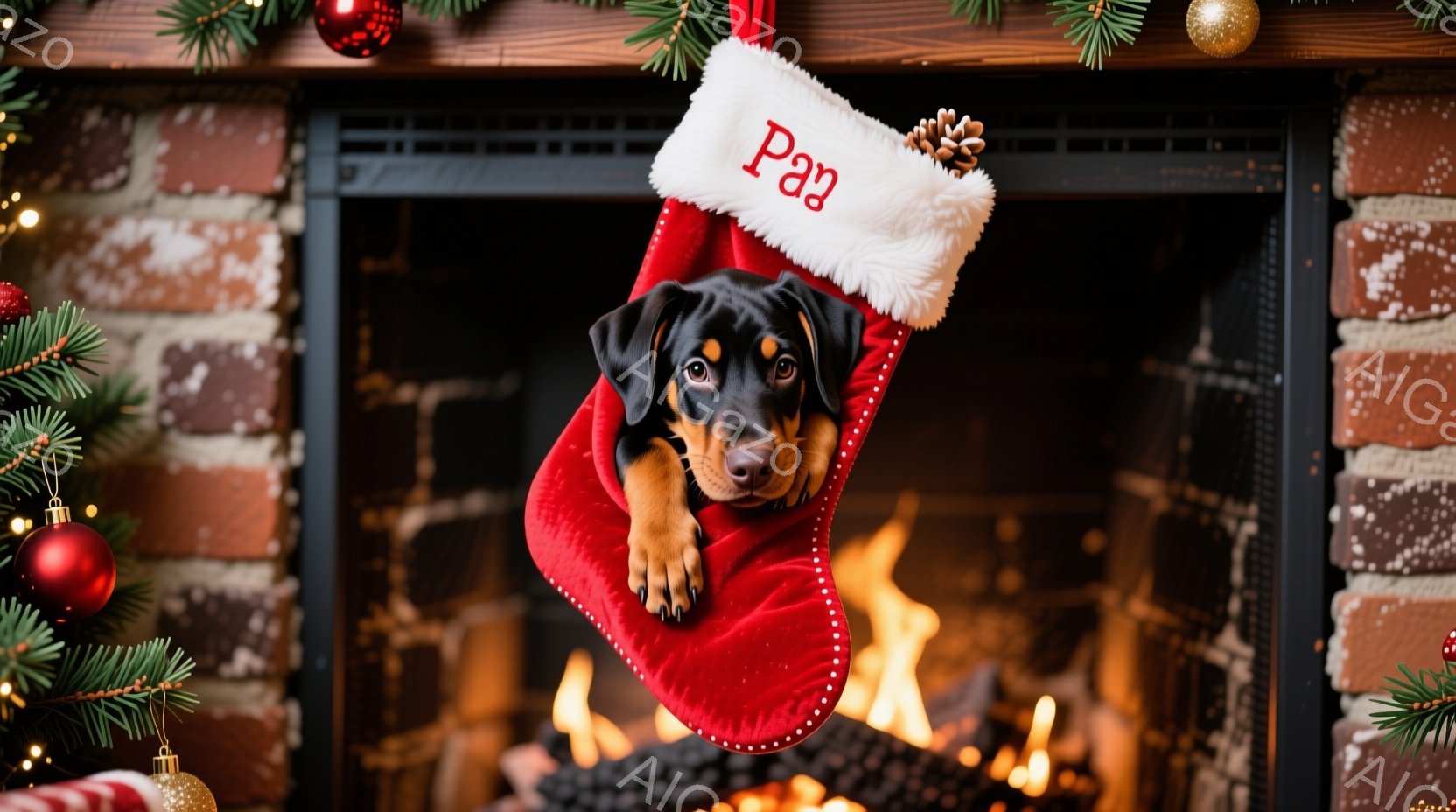 赤いクリスマスストッキングの中に、茶色と黒の毛並みの小さな子犬が顔を出しています。子犬は少し不安そうな表情で、前足をストッキングの縁につかまり、好奇心と緊張が入り混じった様子です。背景には暖炉の炎と、クリスマスツリーの装飾が見え、温かく、お祝いムードに満ちた雰囲気が漂っています。
