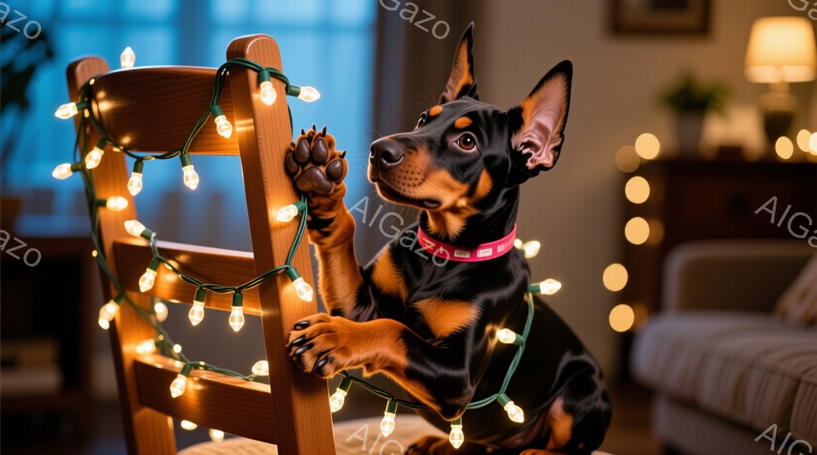 茶色と黒の毛並みを持つ小型犬が、クリスマスツリーの電飾に囲まれた木製の椅子に座っています。犬は前足を上げて何かを要求しているかのように見え、その表情は好奇心と遊び心に満ちています。背景にはぼやけた室内が写っており、暖かく穏やかな雰囲気が漂っています。