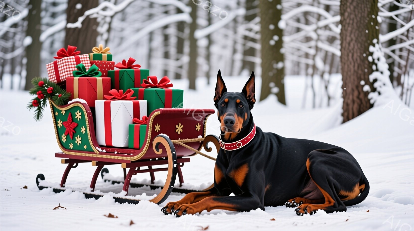 真っ白な雪景色の中に、赤いそりがプレゼントの山と共に置かれている。そばには、黒と茶色のドーベルマンが横たわり、赤い首輪をつけている。背景には雪で覆われた木々が立ち並び、クリスマスの暖かく穏やかな雰囲気を醸し出している。