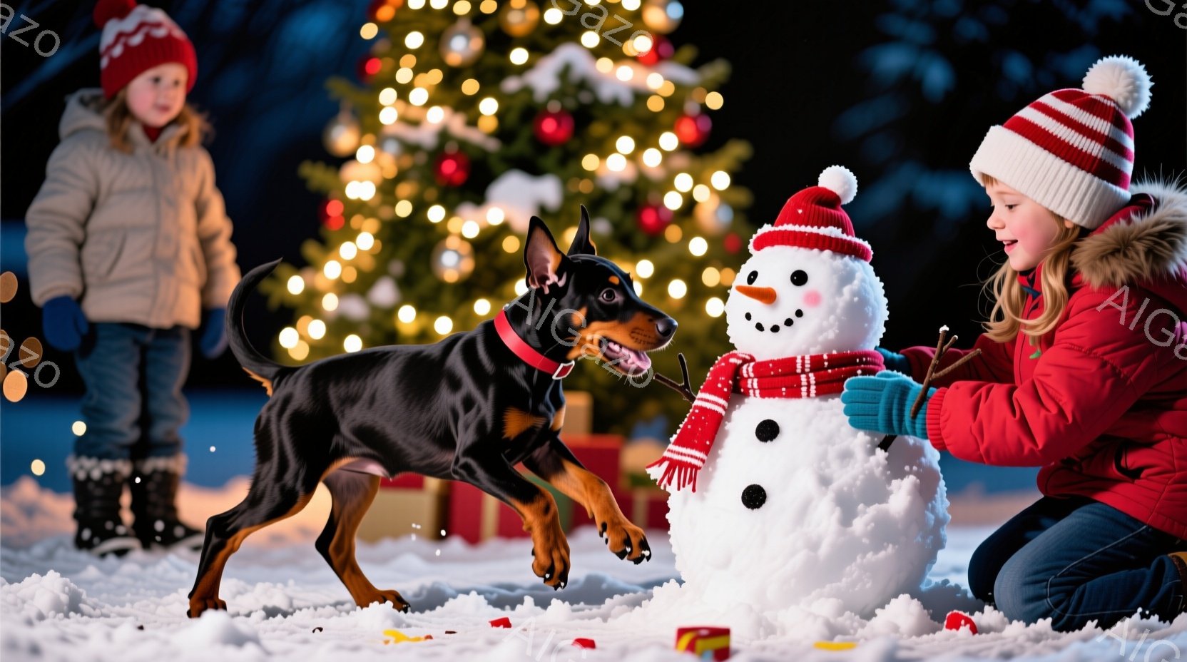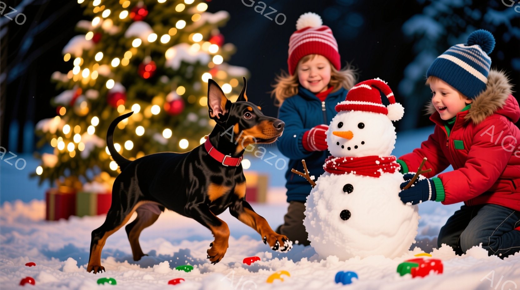 雪景色の中で、二人の子供と一匹の犬が雪だるまを作っています。女の子は赤いコートと帽子を着用し、雪だるまに枝を腕に見立てて取り付けようとしています。男の子は緑のジャケットを着ており、黒いテリアの犬は興奮して子供たちを見つめています。背景には、イルミネーションで飾られたクリスマスツリーと、ぼんやりと見える建物があり、暖かく、お祭り気分に満ちた雰囲気です。
