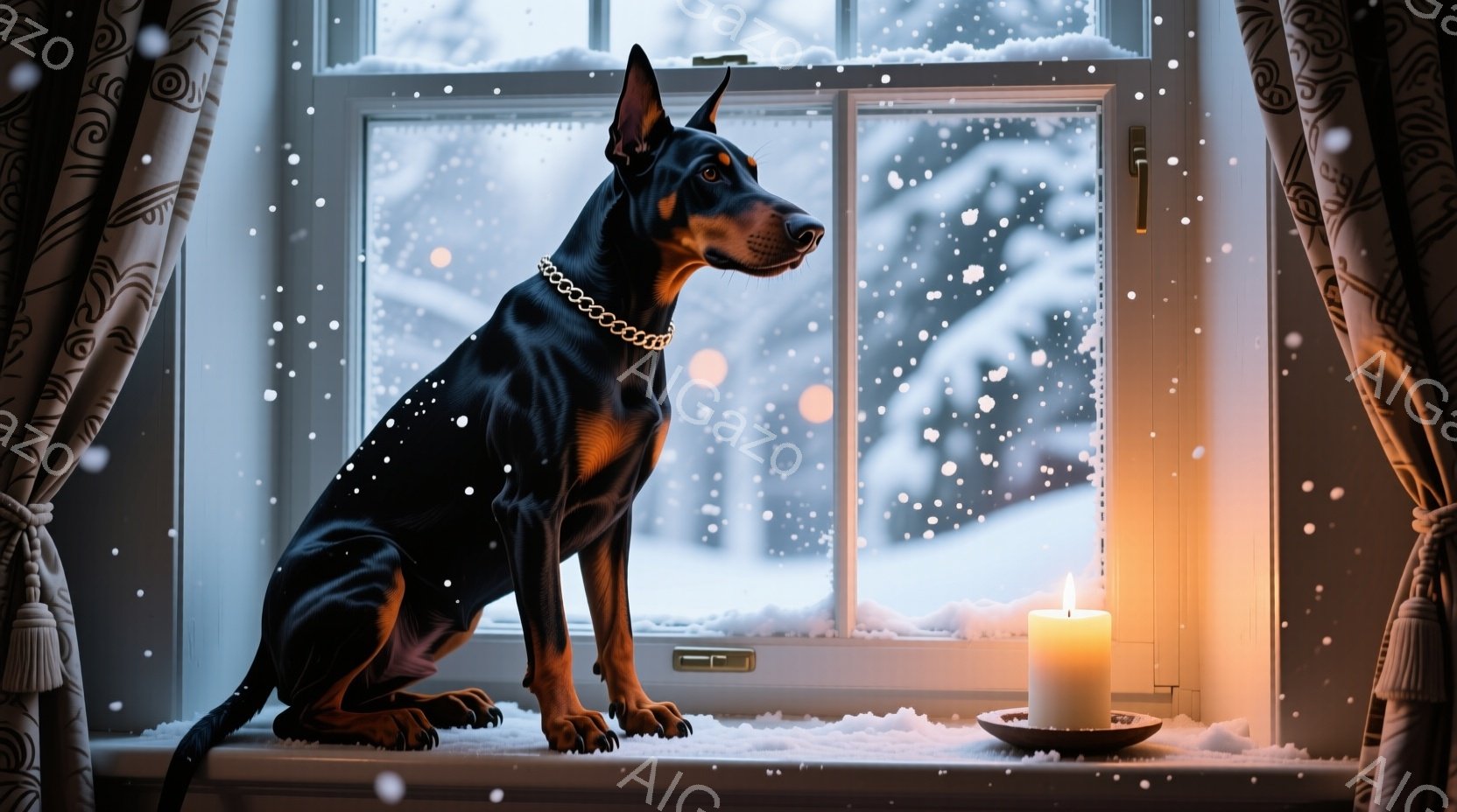 黒いドーベルマンが雪が降る窓辺に座って外を見つめている。室内には暖かそうな光が灯ったキャンドルがあり、窓枠には雪が積もっている。外は雪景色で、全体的に静かで穏やかな冬の雰囲気が漂っている。