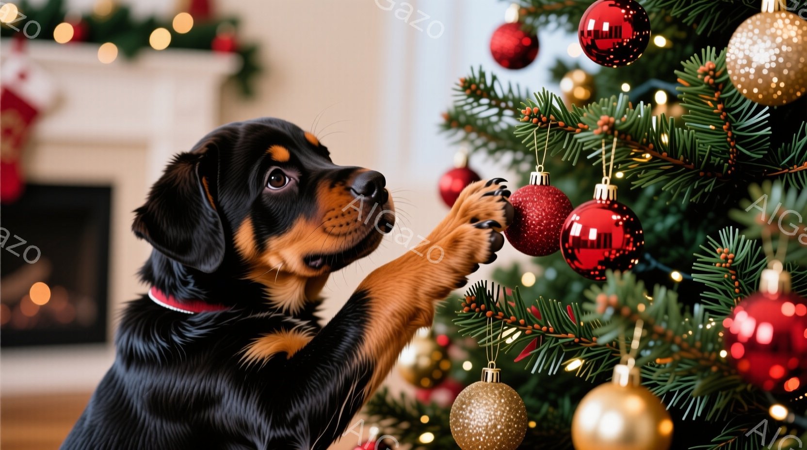黒と茶色の毛並みの幼い犬が、クリスマスツリーの緑の枝に前足をかけて遊んでいます。ツリーには赤や金色のオーナメントが飾り付けられており、背景にはぼんやりと暖炉やクリスマスソックスが見えます。全体的に暖かく、遊び心のある、お祝いの雰囲気が漂っています。