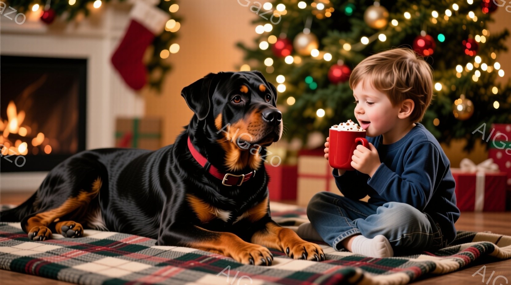 赤ちゃんは水色のズボンとグレーのセーターを着て、床に座って白いマグカップを両手で持っています。大きなロットワイラー犬が赤ちゃんの隣で横になり、見つめています。背景には、クリスマスツリー、プレゼント、暖炉があり、温かく、お祝いの雰囲気が漂っています。